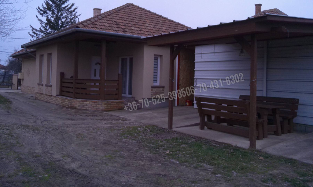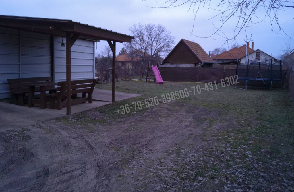 Autó tárolásra két állásos lemezgarázs épült, mellette tároló. Az udvar kiváló családi- baráti összejövetelek rendezésére, e célra faácsolatos filagória épült, tömörfa kerti bútorokkal. Mellette medence és gyermekjátszótér is helyet kaphat. A kerítés új, egyedi kivitelezésű, 2 oldalra nyíló elektromos kapuval.