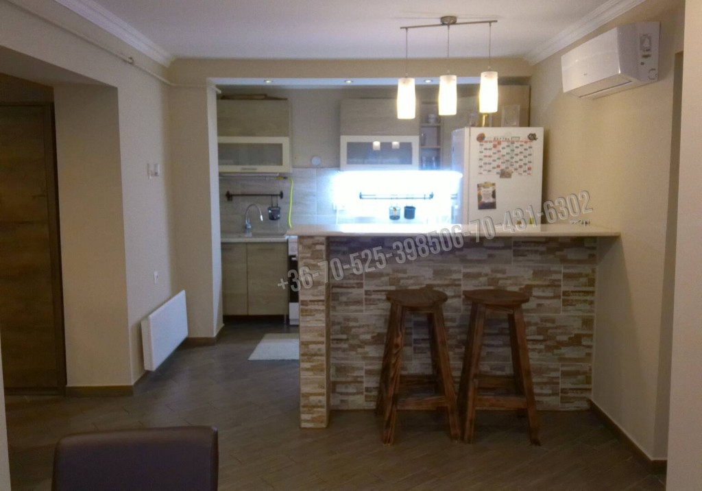 A konyhában a beépített konyhaszekrény a reggelizőpulttal a vételár részét képezik. A hátsó hálószobából egy terasz ajtó a keleti fekvésű gres lapos faácsolatos teraszra nyílik.