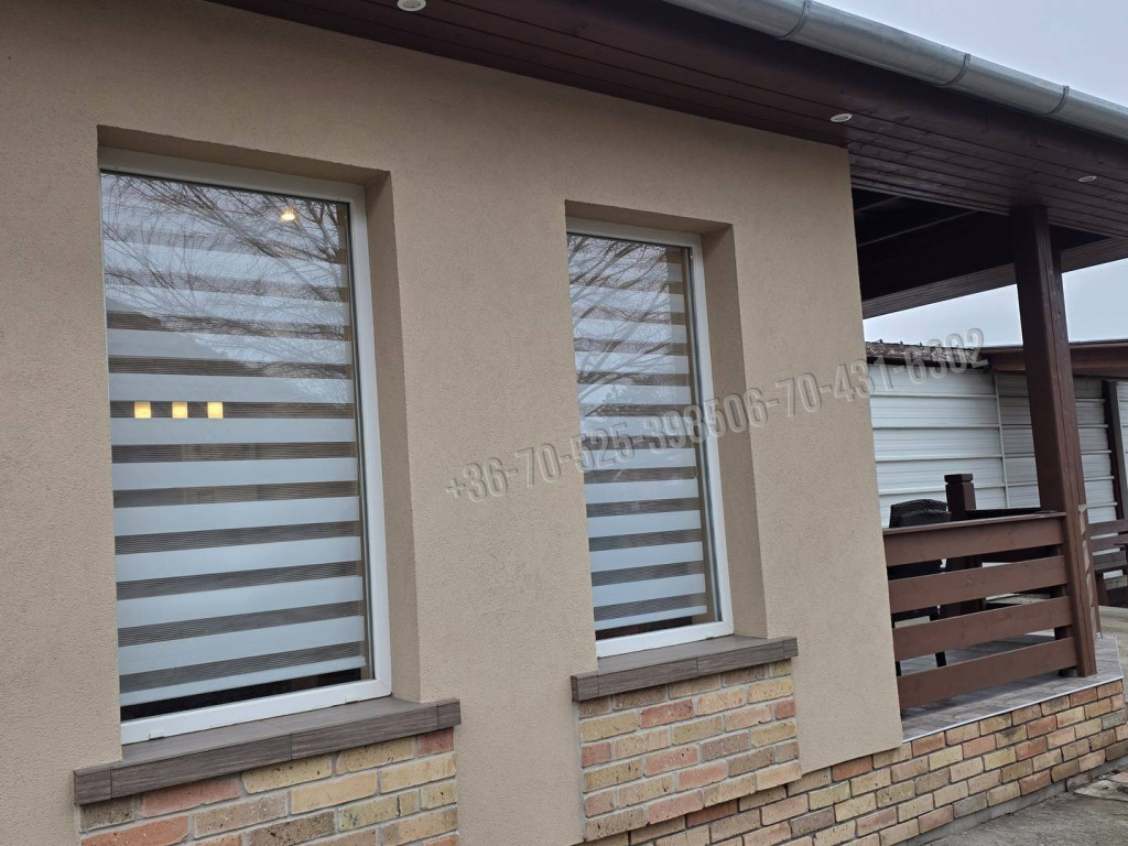 A nyílászárók fehér 2 rétegű hőszigetelt műanyagok, redőnnyel, szúnyoghálóval felszereltek.