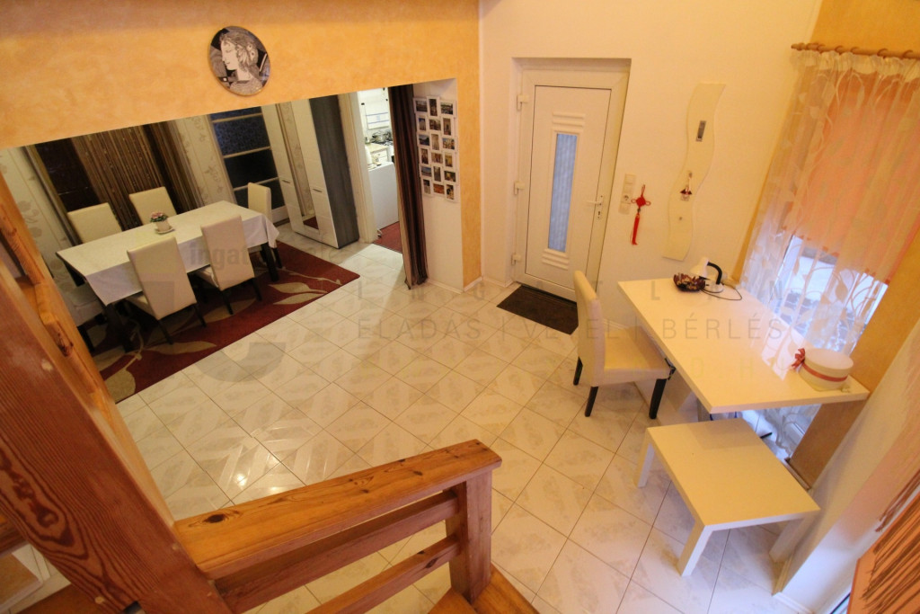 A 311 m2-es telekre téglából épült belső 2 szintes, 151 m2-es ház többszöri bővítés, modernizálás során nyerte el mai elrendezését. Az alsó szinten 2 szoba, gardrób, tágas előszoba-étkező, konyha, kamra, fürdő és udvari bejáratot is biztosító kazánház található. A felső szinten fürdőszoba, jelenleg egy térben kialakított konyha, étkező, nappali és hálósarok, valamint 1 külön szoba van.