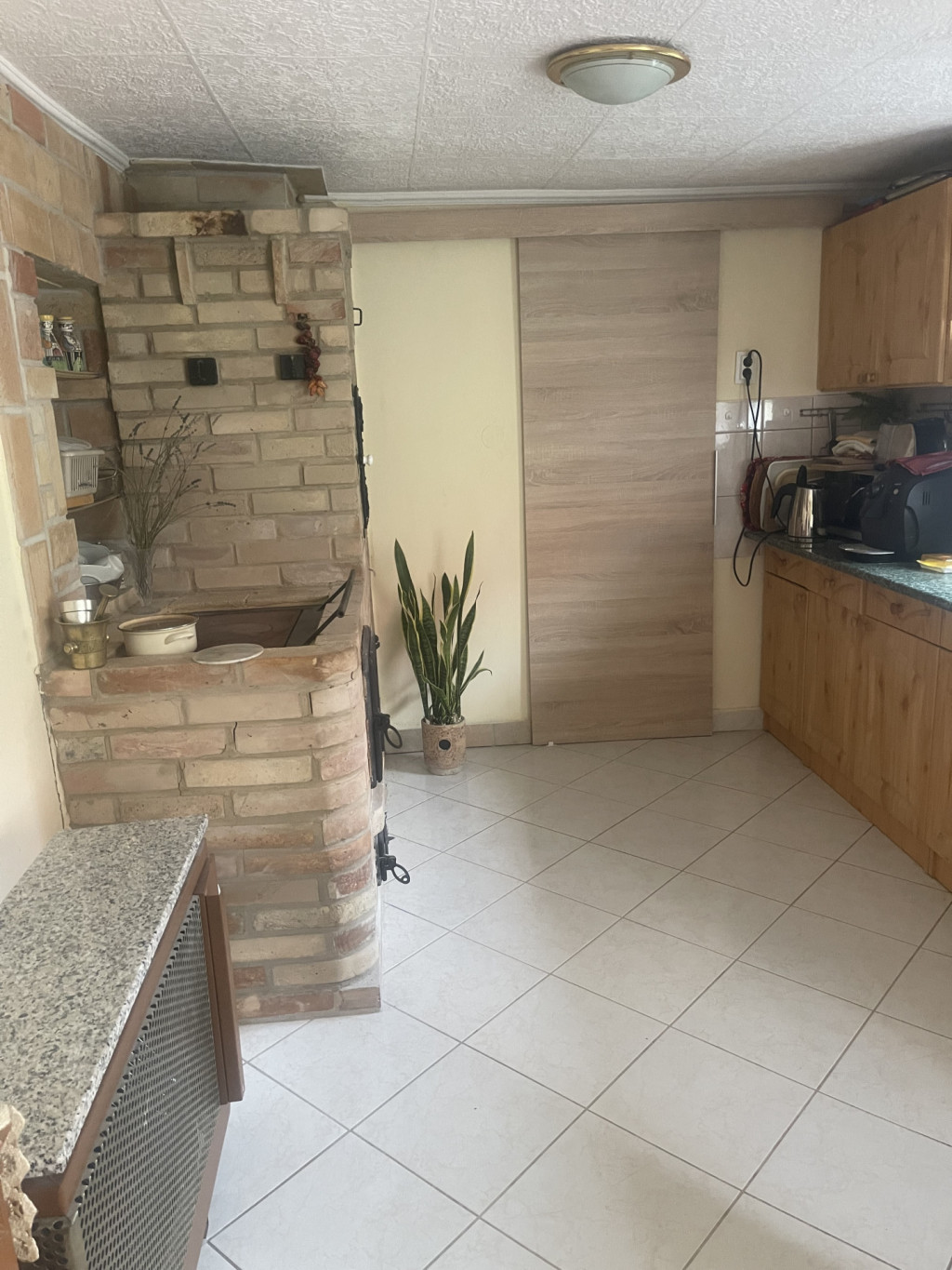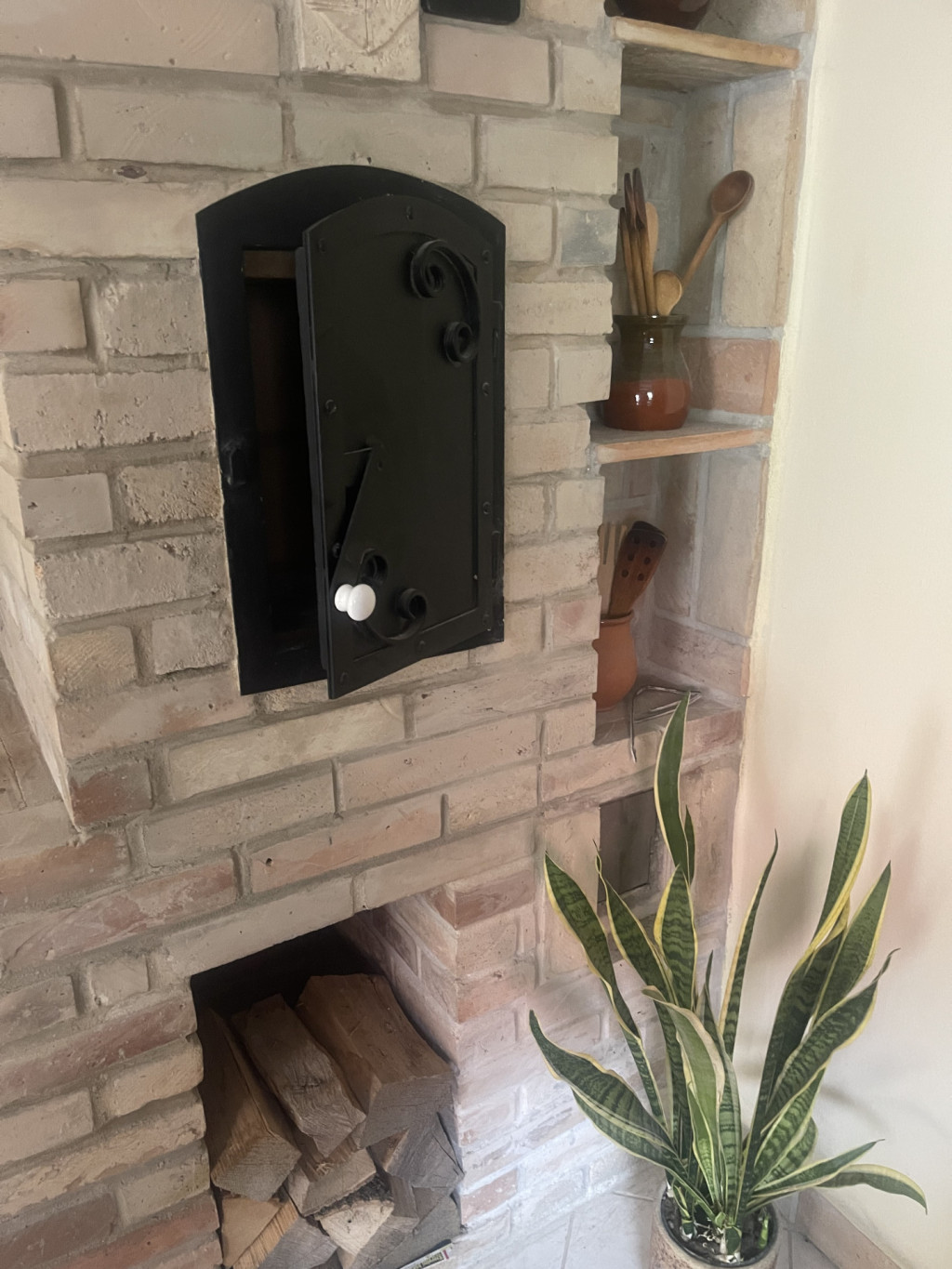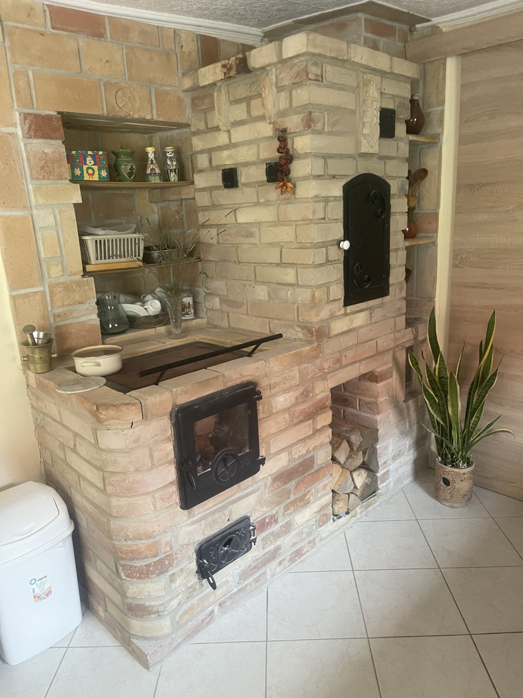 Fűtése: konvektor és egy fatüzelésű kandalló, ami mellett még egy hangulatos kis kemence is ki lett alakítva.