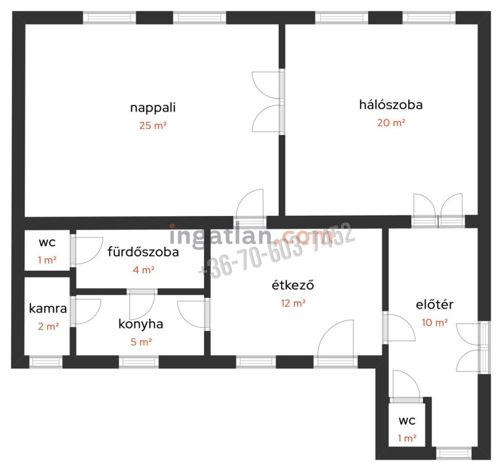 Az elrendezés kiváló: tágas nappali, hálószoba, előszoba, konyha, étkező, fürdőszoba, két mellékhelyiség, valamint egy kamra található az ingatlanban.