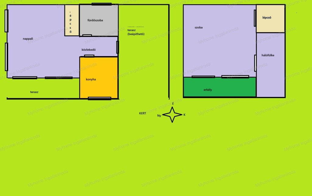 alsószínt: terasz (8,4nm), nappali (16nm), közlekedő 1,71nm), konyha 3,5nm), ablakos fürdőszoba (3nm), keleti fekvésű fedett terasz (21nm)