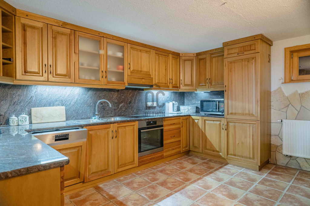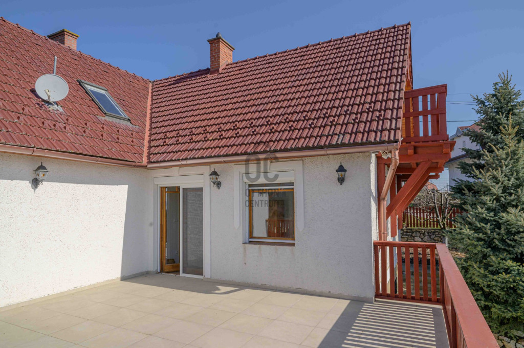 Kényelmes faburkolatú lépcső vezet a következő szintre, ahol egy 36 m2-es panoráma terasz hívogat. Mind a felső nappali, mind a nagyobbik hálószoba teraszkapcsolatos. A nagy hálóból nyíló, ugyancsak panorámát nyújtó fürdő és toalett jakuzzi káddal, zuhannyal és bidével felszerelt. További helyiségek egy vendéháló, második fürdő és egy kis tároló. Mivel ez a lakrész kívülről is megközelíthető és a nappaliban egy konyhasarok kialakításához alkalmas vízes kiállásokat is készítettek, két generáció életéhez vagy több család zavartalan nyaralásához is adottak a feltételek. Csupán érdekességként: a rusztikus dekor tégla falburkolatba pl. az 1800-as évekből származó. G E P (Gróf Eszterházi Pál ) jelölésű darabokat építettek be.