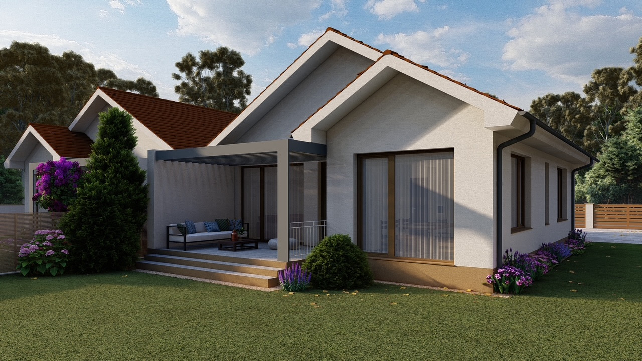 - Pergolával fedett, 14 m²-es terasz – tökéletes hely a reggeli kávéhoz vagy egy családi vacsorához a szabadban