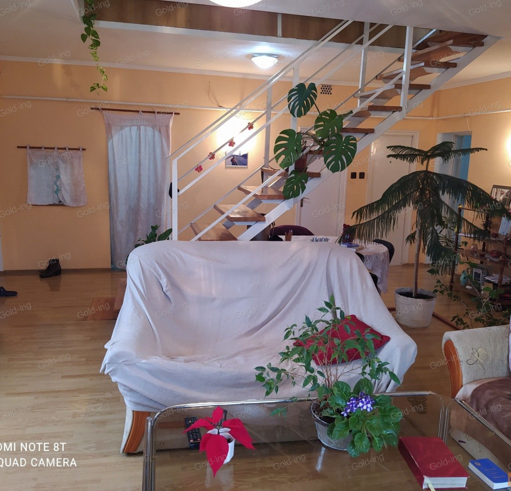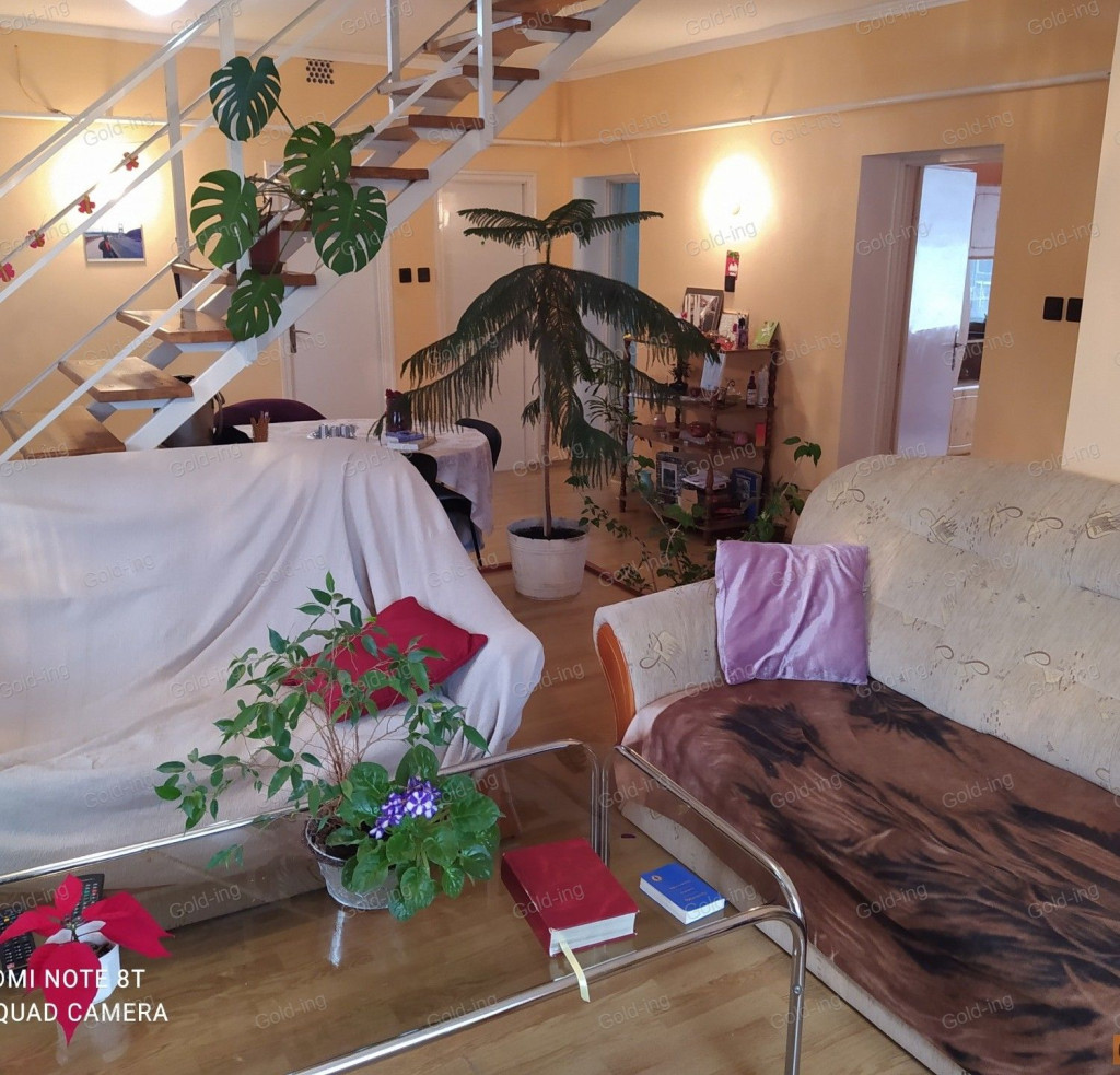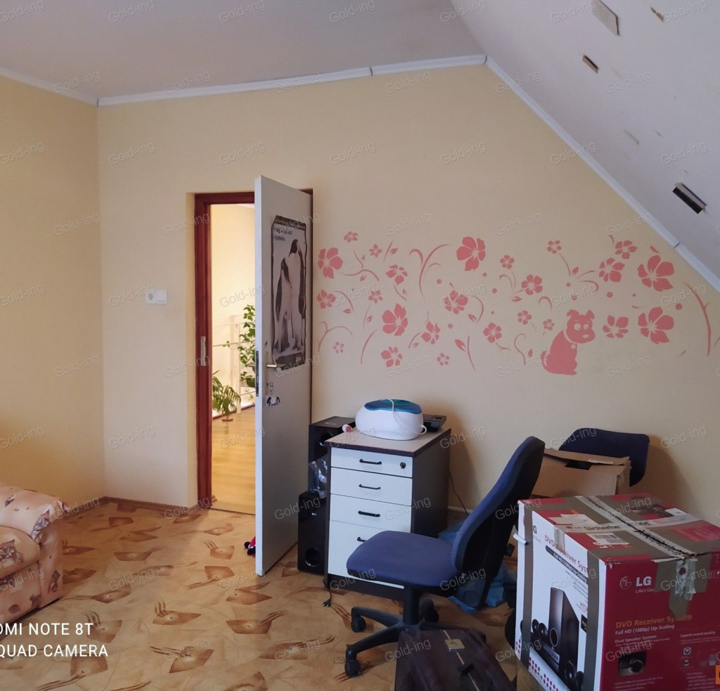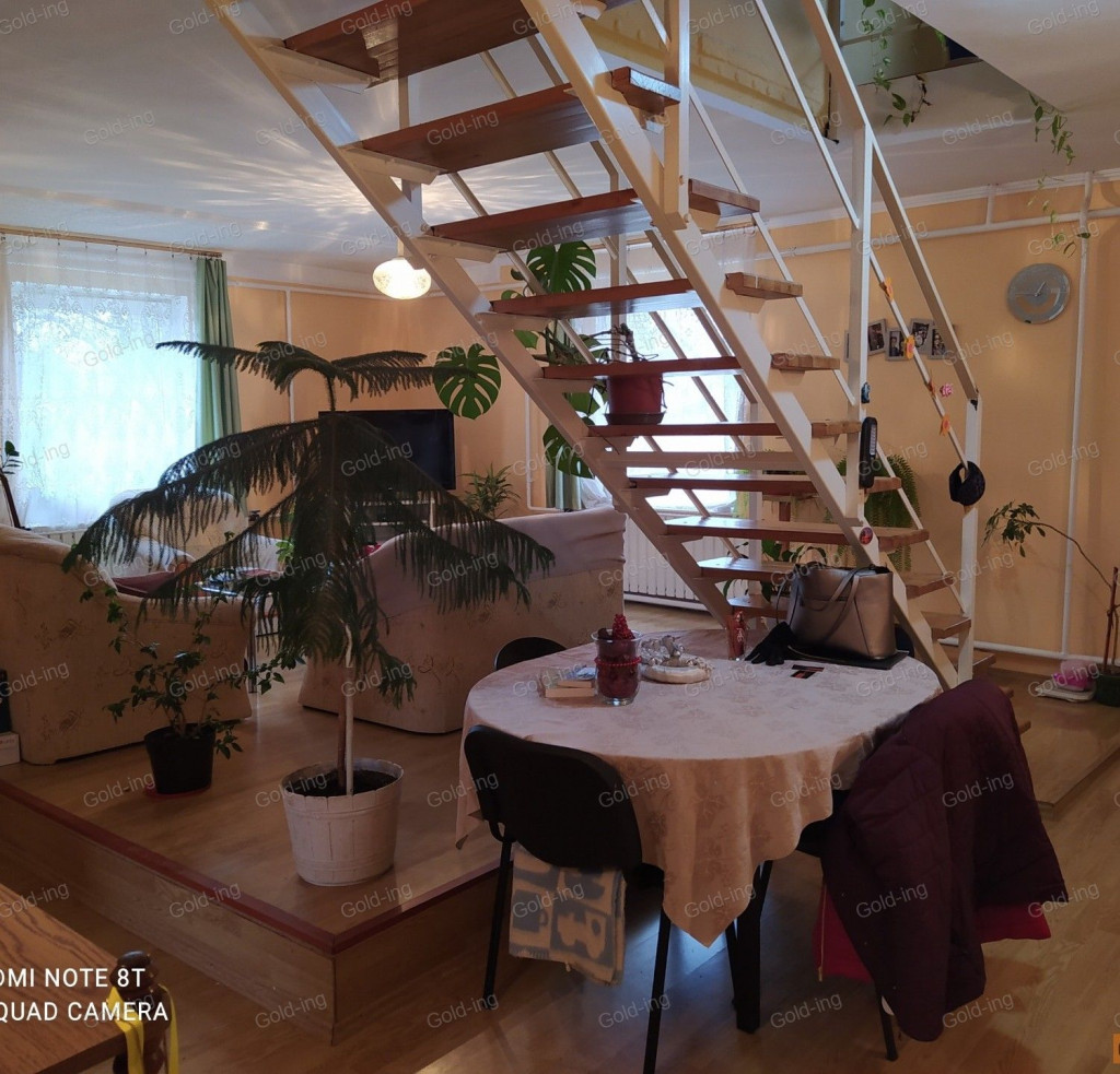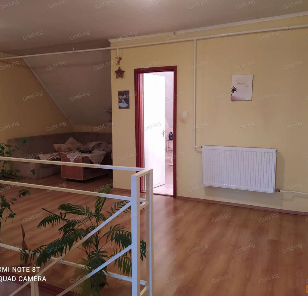 A nappaliból vezet egy nagyon kényelmes lépcső a tetőtérbe, ahol egy másik nappalit találunk. Itt is van 3 külön bejáratú egész szoba, és egy zuhanyzós fürdőszoba, WC-vel. A fenti, galériás nappali, egy széles közlekedőben folytatódik, ami L alakban végig fut az egész tetőtéren. Természetes fénnyel jól megvilágított, kimondottan világos, nagy teret alkotnak együtt. A lakásnak egyik jó adottsága, hogy a gyerekek és a szülők eltérő szokás szerint használhatják a saját nappalijukat.