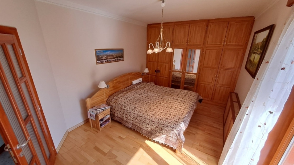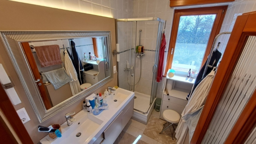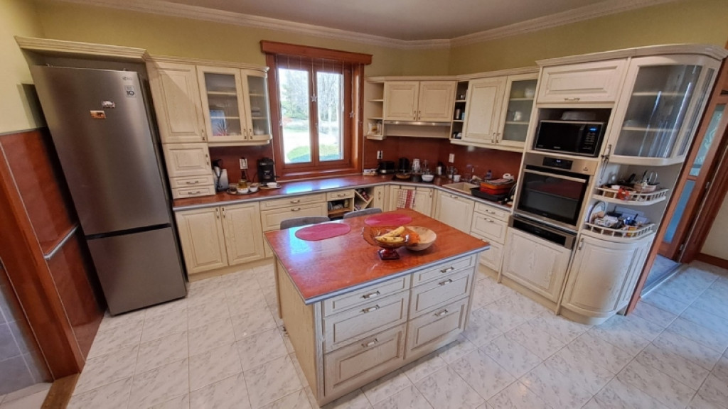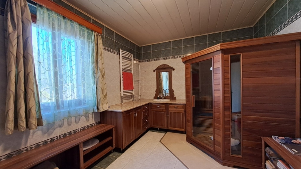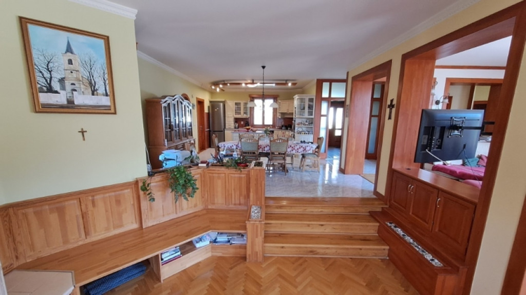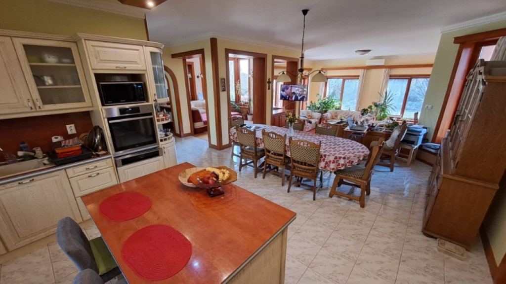 A 180 m2 alapterületű ház tágas terekkel rendelkezik, praktikus elrendezésű, minden helyiség külön nyílik. A nagyméretű, beépített gépekkel ellátott étkezős konyhához szinteltolással kapcsolódik a hatalmas és világos nappali, a két helyiség összesen kb. 70 m2, tehát rendkívül élhető méretű. Ezen kívül van még 3 külön nyíló szoba, 2 db fürdőszoba, az egyikben egy infraszauna is található, továbbá van még egy mosdó, egy gardrób és egy kamra is.