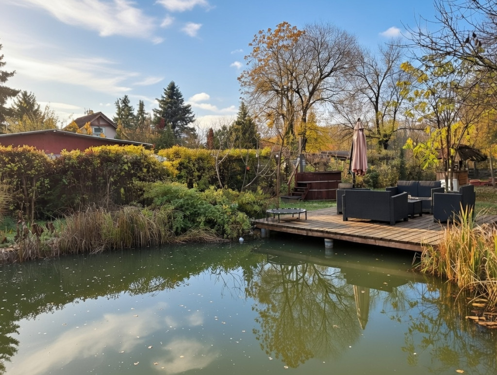 - Fürdésre és horgászatra is alkalmas kerti tó vízeséssel, sziklakerttel