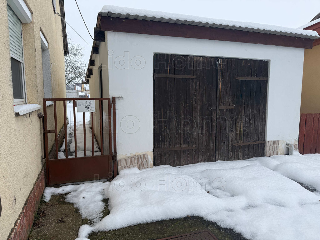 Az ingatlanhoz különálló szerelőaknás garázs, egy udvari lemezgarázs vagy tároló, valamint egy polikarbonáttal fedett terasz tartozik. A füvesített kertben gyümölcsfák és cserjék találhatók, az udvarban és a ház előtt több autó parkolására is van lehetőség.