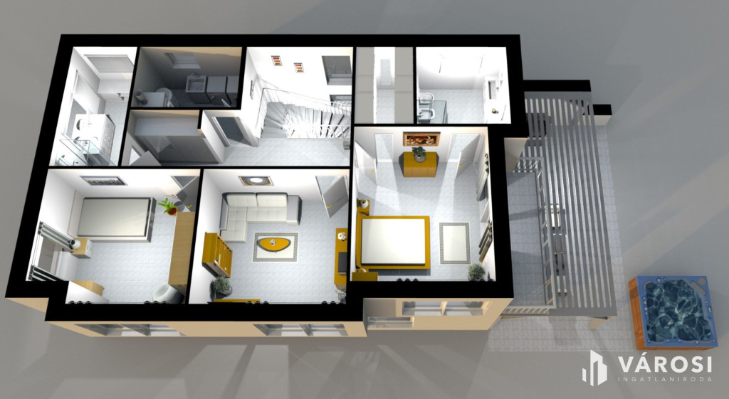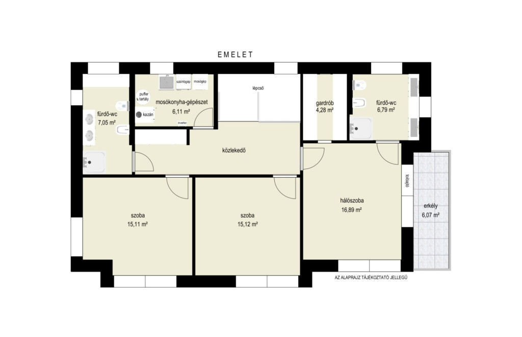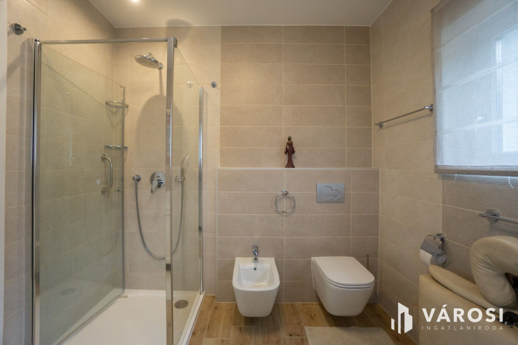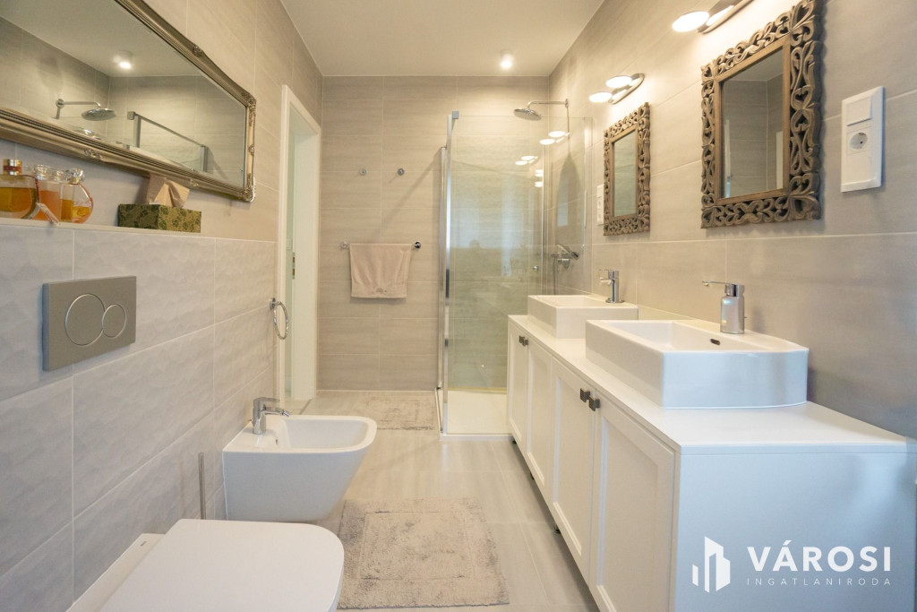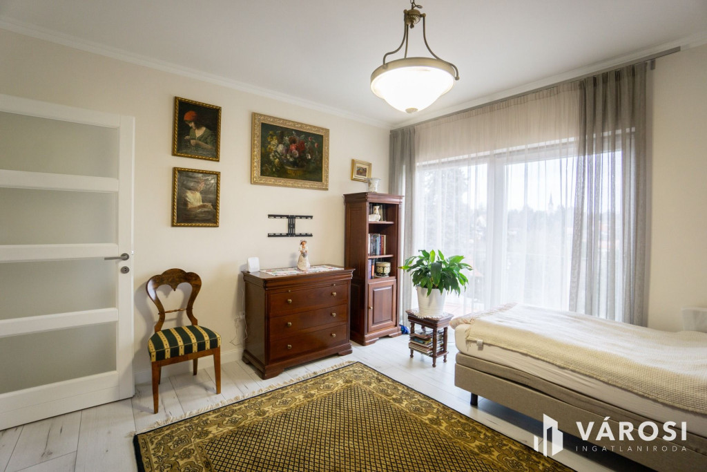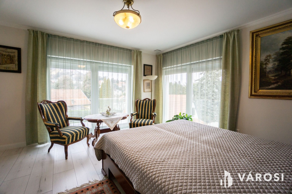 Az emeletre kényelmes lépcső vezet fel, ahol 3 hálószoba található panorámás kilátással, egy háztartási helyiség, valamint két zuhanyzós fürdőszoba, mindkettőben wc és bidé is rendelkezésre áll. Az egyik szoba a saját fürdő mellé egy klassz gardróbot és egy közel 6m2-es remek kilátással bíró erkélyt is kapott, mely ideális szülői hálószobának.