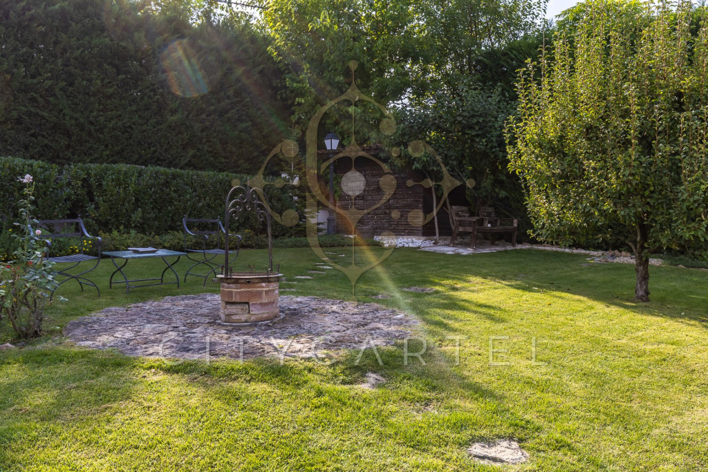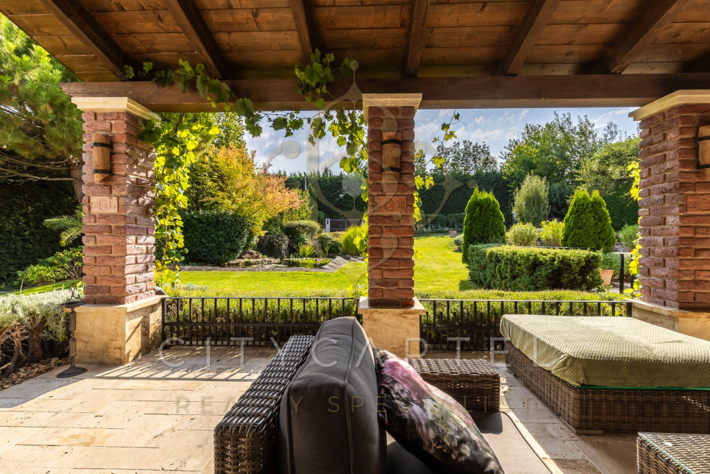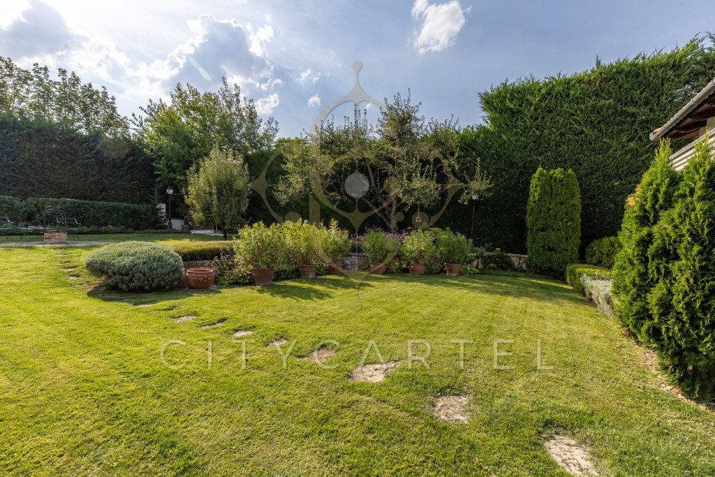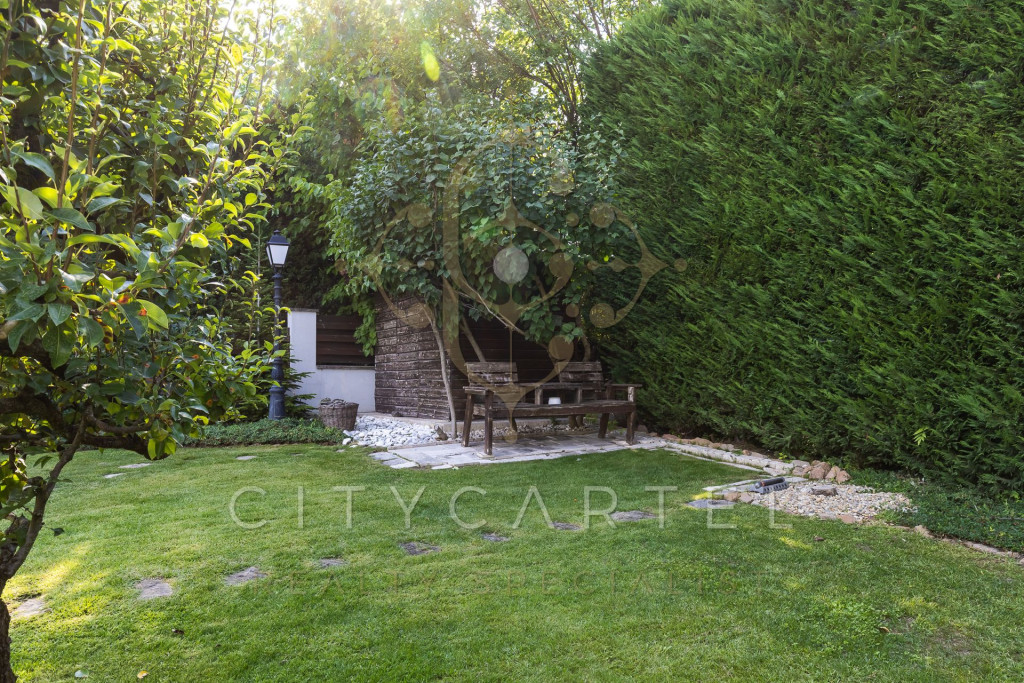 A kert minden négyzetmétere tudatosan tervezett: dús növényzet, tavirózsás halastó, különféle burkolatok, árnyas pihenőzónák és egy hangulatos borospince gondoskodnak az idilli hangulatról és teljes intimitásról.