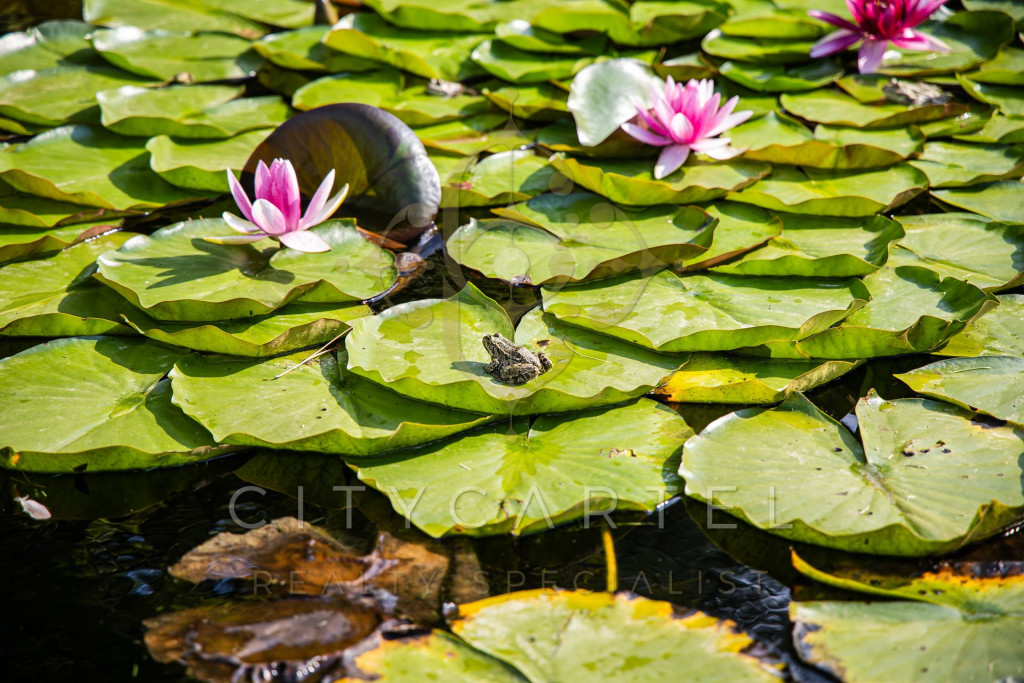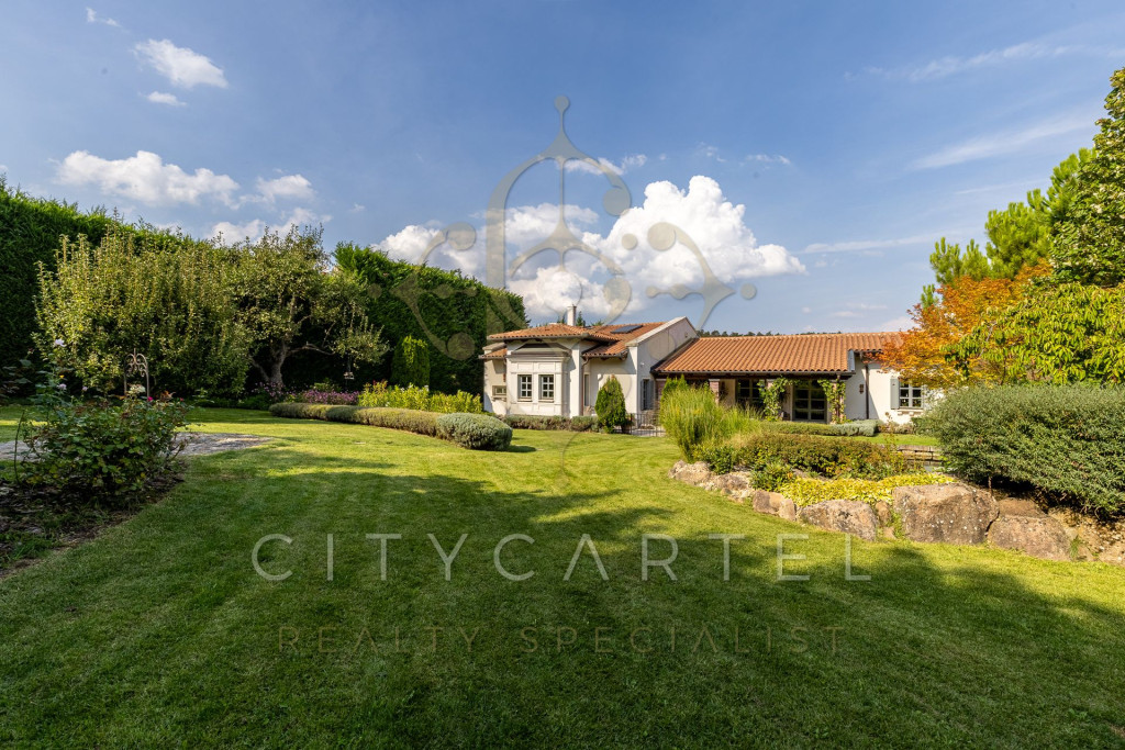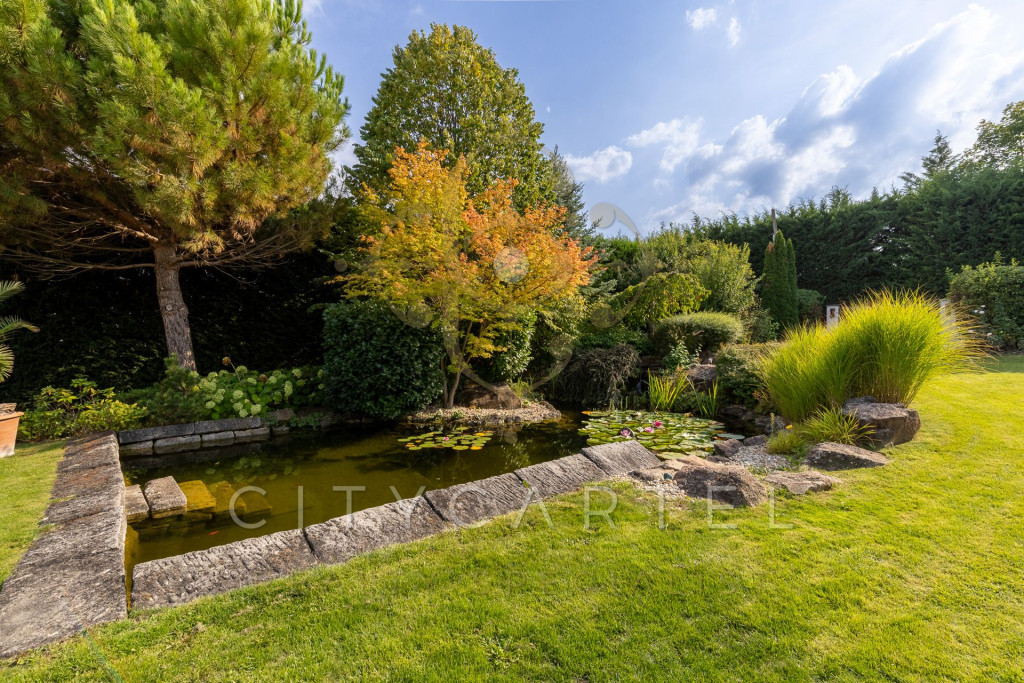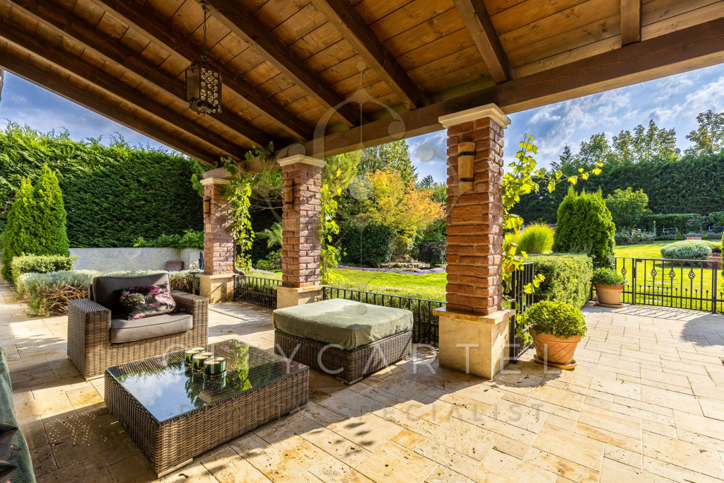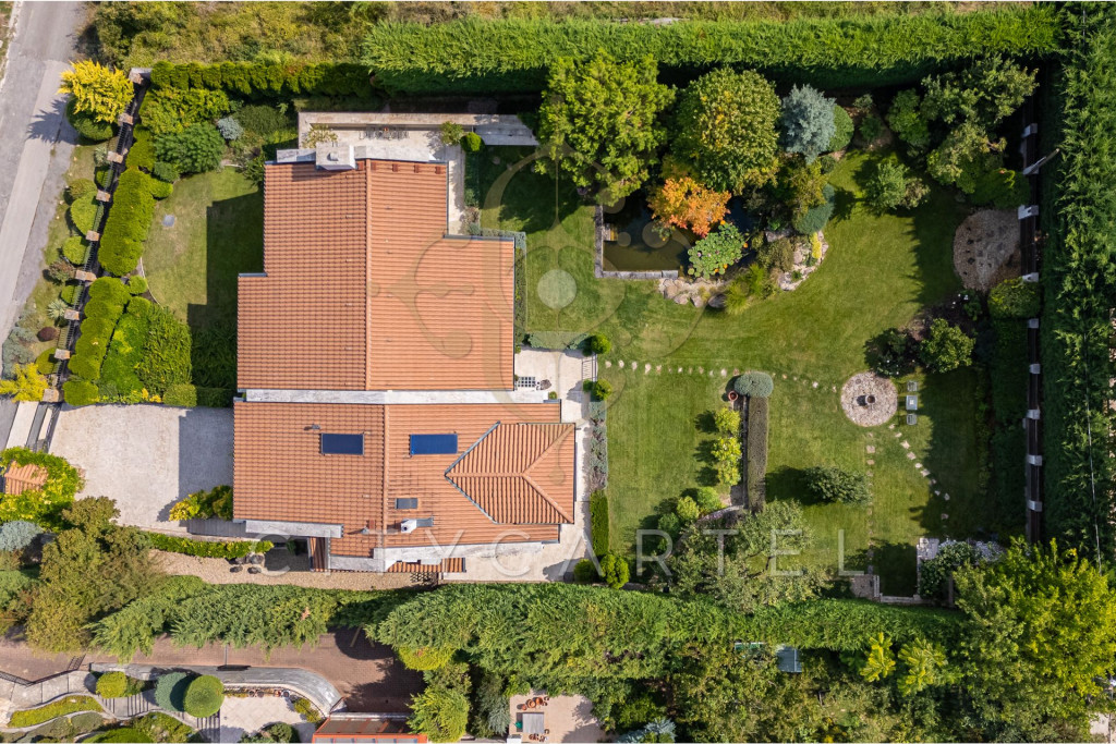 A kert minden négyzetmétere tudatosan tervezett: dús növényzet, tavirózsás halastó, különféle burkolatok, árnyas pihenőzónák és egy hangulatos borospince gondoskodnak az idilli hangulatról és teljes intimitásról.