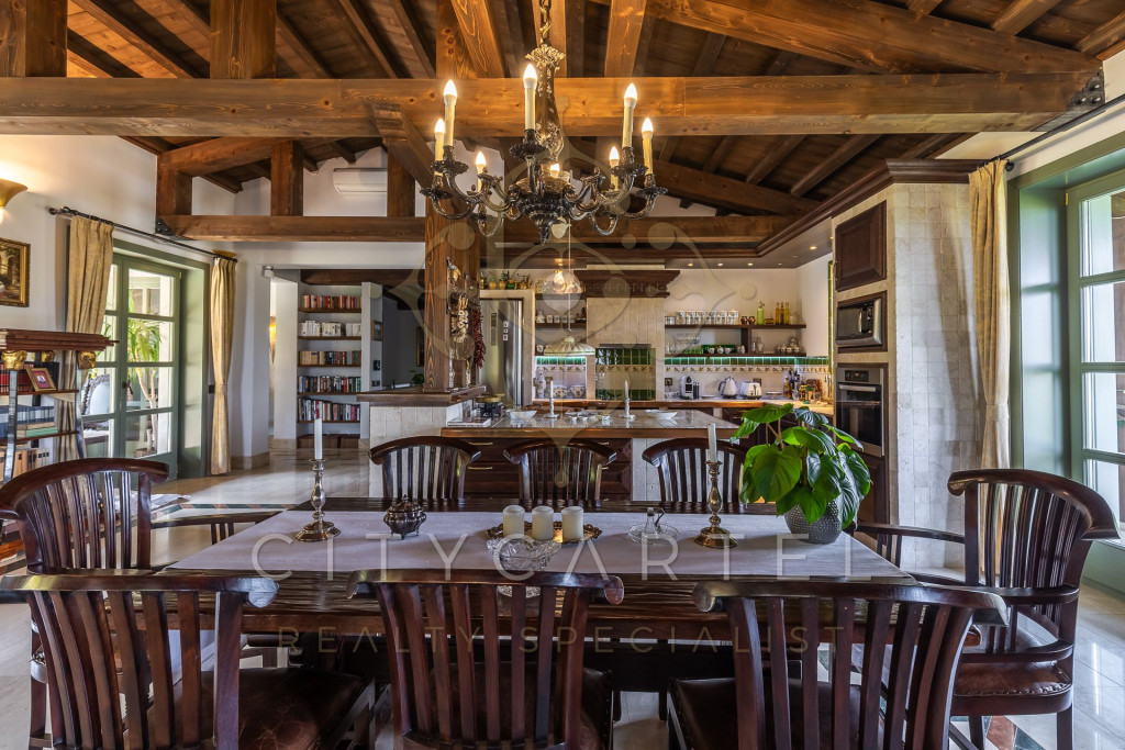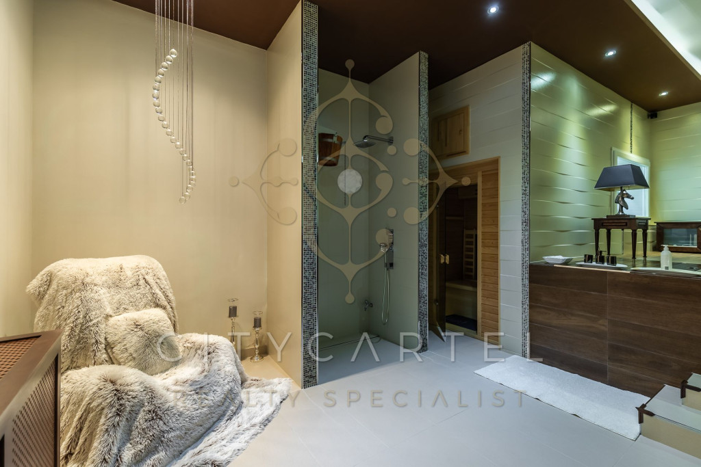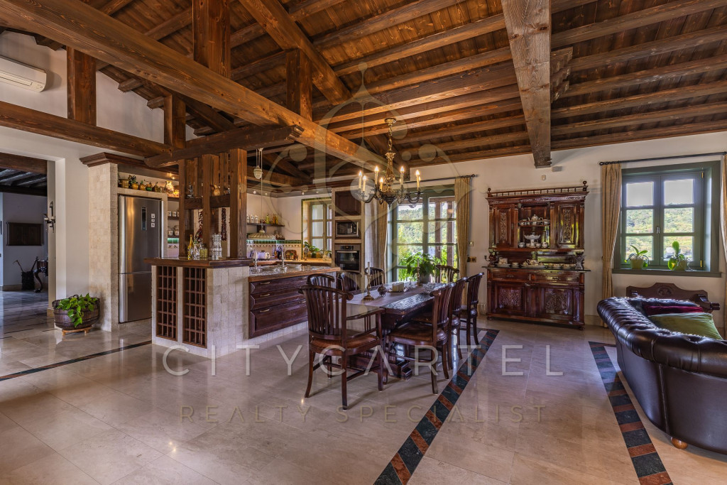 A belső terekben dominál a természetes anyaghasználat: prémium mészkő, márvány, kézműves faasztalos munkák, látványos fa gerendák.
