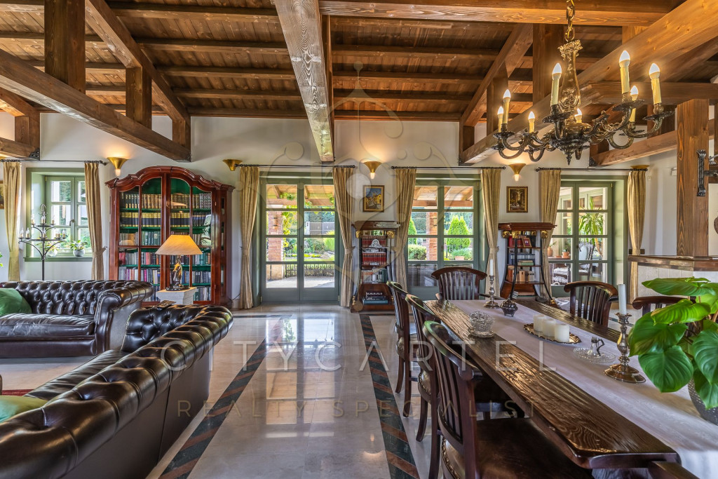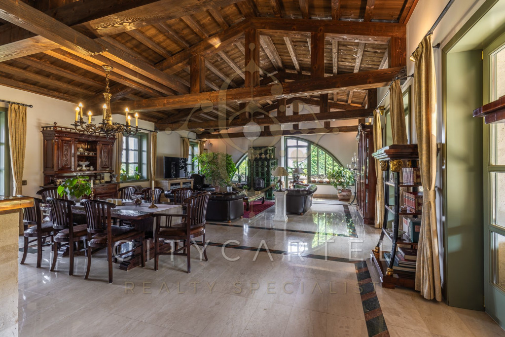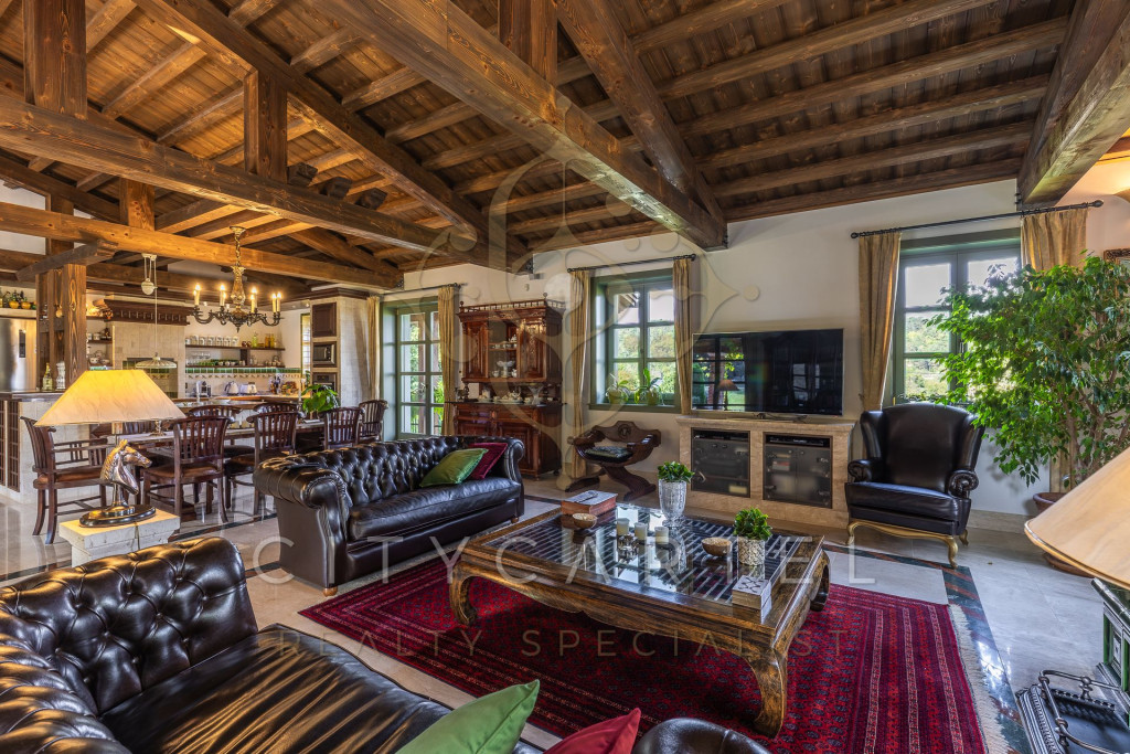Reprezentatív, fagerendás mennyezetű nappali–étkező–konyha egy légtérben, kandallóval