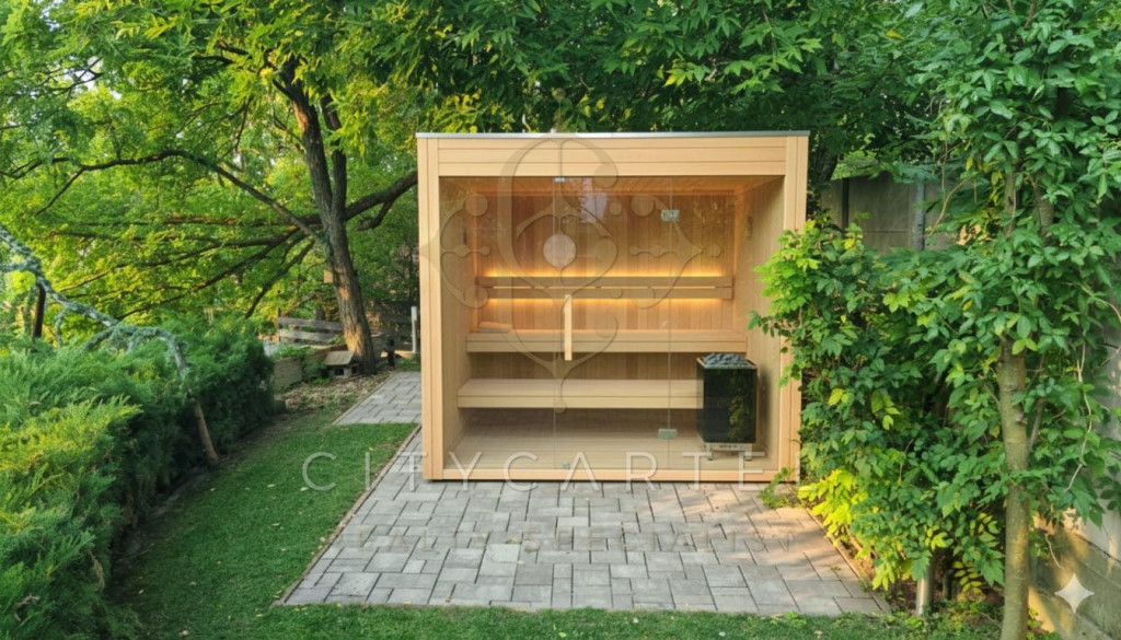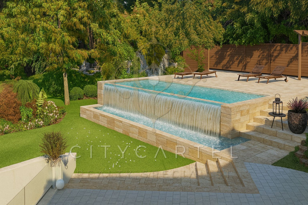 A hirdetés medence, szauna, és a sütögető terasz látványtervét tartalmazzák, amelyek szintén kialakíthatóak.
