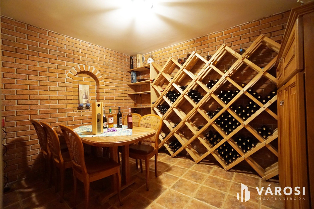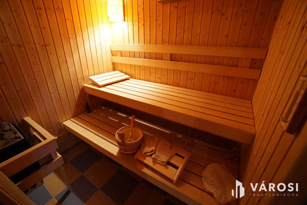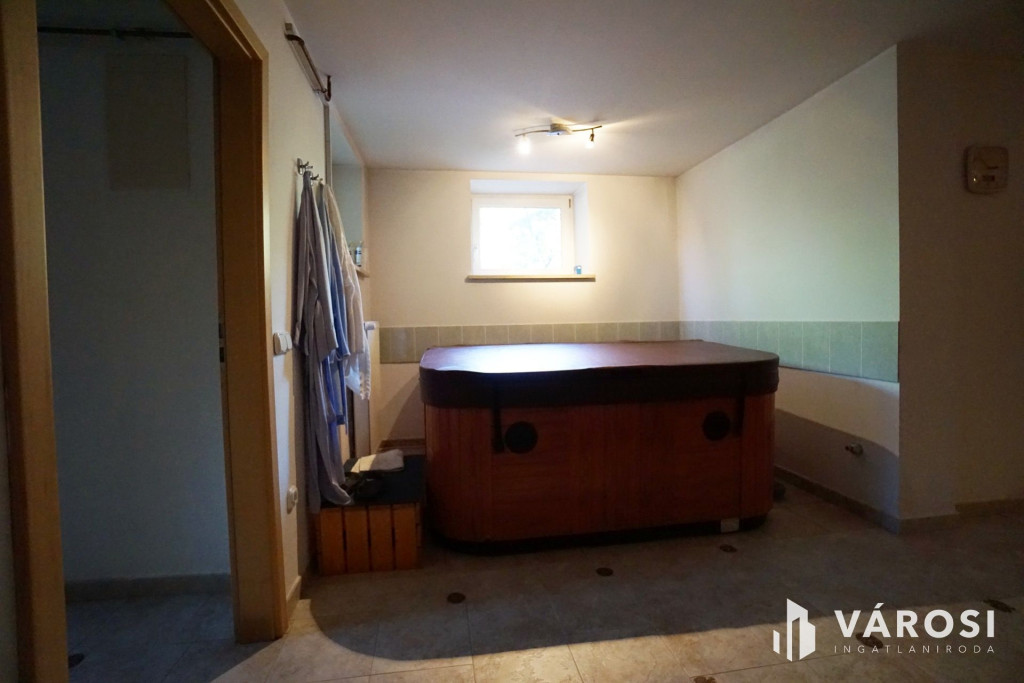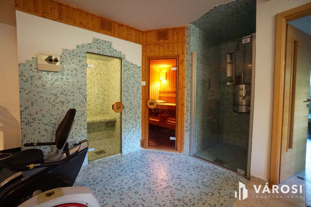 Az alsó szinten egy külön bejárattal is rendelkező, teljes értékű wellness- és szabadidőtér található: szauna, gőzkabin, jakuzzi, konditerem, élmény zuhany, pihenő tér és boros szoba biztosítja a kikapcsolódást. A kialakításnak köszönhetően ez a szint akár külön lakrészként vagy vállalkozási célra is hasznosítható.
