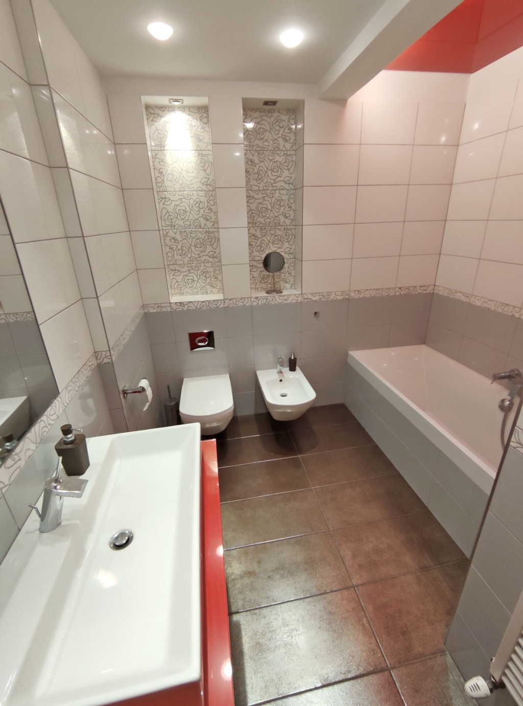 Az első emeletre a belső lépcsőházban tovább haladva jutunk fel. A bejárati ajtón belépve a 11,47 nm-es padlószőnyeges klímával felszerelt előtérbe jutunk, ahonnan a három padlószőnyeges hálószoba található, ami nagyon komfortos barátságos érzetet nyújt. Jobbra a 13 nm-es ablakos, belső udvarra néző, beépített gardrób szekrénnyel ellátott szoba található. Innen kilépve az előtérből balra nyílik a kádas fürdőszoba, ami magában foglalja a toalettet is. Szemben szintén a 14 nm-es ablakos, padlószőnyeges, gardróbbal felszerelt hálószoba nyílik. Jobbra pedig a harmadik ablakos gardróbos hálószoba kapott helyet. Ez a szint, nagyon praktikus megoldás a nyugodt pihenés biztosítására.