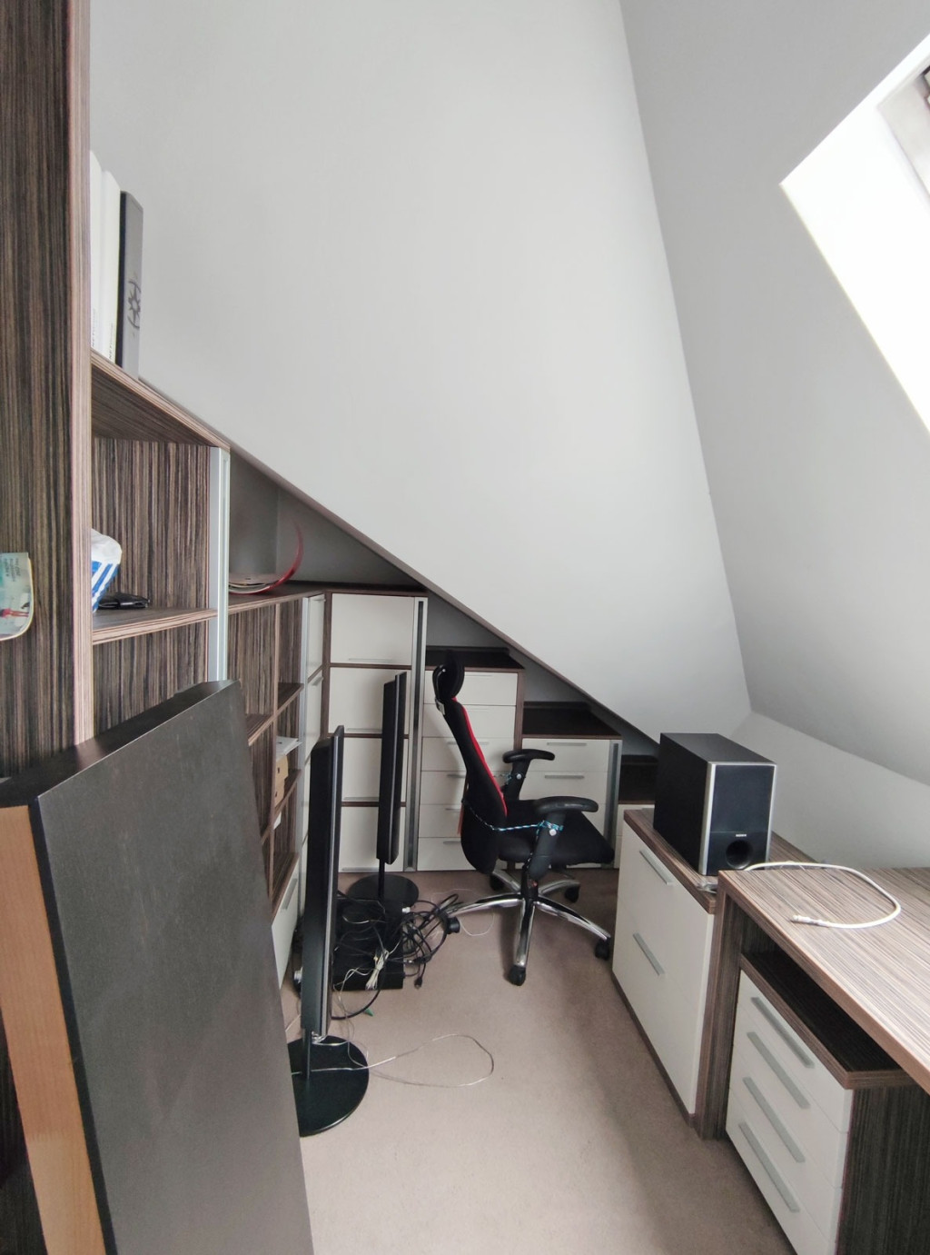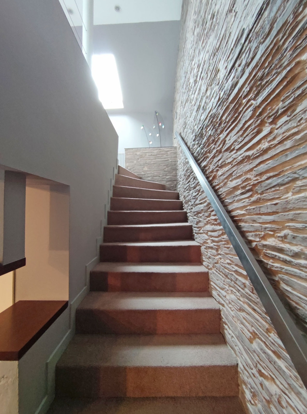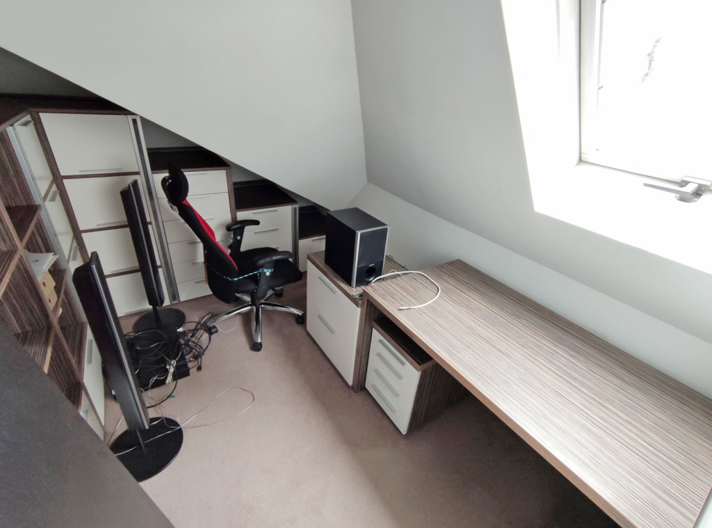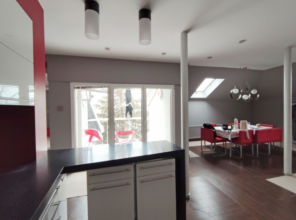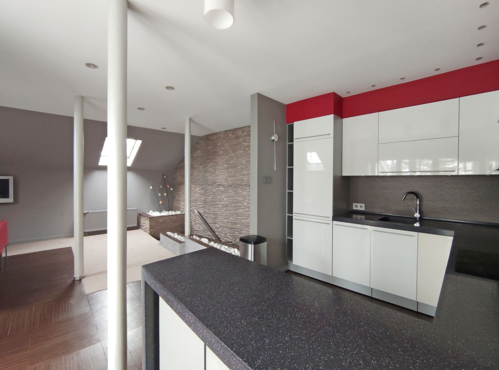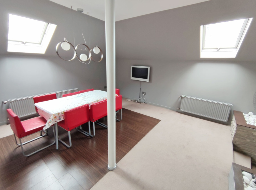 Innen kilépve a zárt lépcsőn felfelé haladva a tetőtérben kapott helyet a 34 nm-es gépesített, elektromos főzőlapos, modern bútorozott, amerikai konyhás, klímás nappali, a konyhai résznél járólappal burkolt, ezen kívül itt is padlószőnyeg szolgálja a komfort érzetet, innen nyílik a 3,6 nm-es loggia ahol napozni, kávézni lehet reggelente, plusz még ebben a légtérben, egy 24,30 nm-es társalgó-nappali szoba került kialakításra, amiből egy 2,7 nm-es dolgozószoba nyílik, mellette pedig a zuhanyzós fürdőszoba található, a külön nyíló toalettel. Itt is kapott helyet egy 2,9 nm-es tároló amiben a mindennapi főzéshez szükséges dolgokat lehet tárolni.