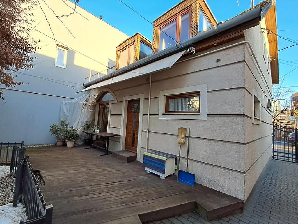 Az öntözőrendszerrel ellátott hangulatos kerttel egy 21 m2-es vörösfenyőből készült terasz köti össze a házat, ahol az árnyékolás egy elektromos napellenzővel szabályozható.