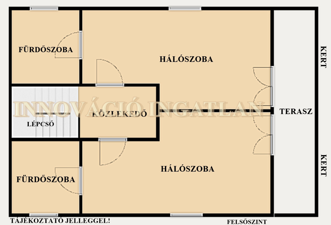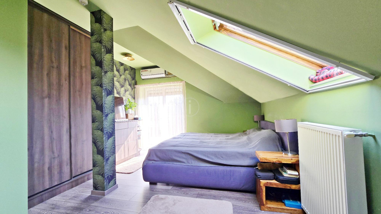 - TÁGAS, étkezőrészes GÉPESÍTETT KONYHA, GARDRÓBSZOBA, a TERASSZAL és a KERTTEL közvetlen kapcsolatos NAPPALI, HÁLÓSZOBA, ebből nyílóan FÜRDŐSZOBA, plusz mellékhelyiség, előszoba elosztású, az EMELETEN