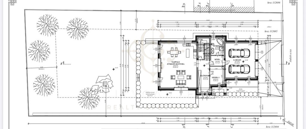 A hatalmas, 1078 nm-es telken a ház a telek első felében helyezkedik el, ahonnan a kényelmes dupla garázsba is be lehet állni, míg az óriási terasz hátrafelé került tájolásra az intim, zöld kertre.
