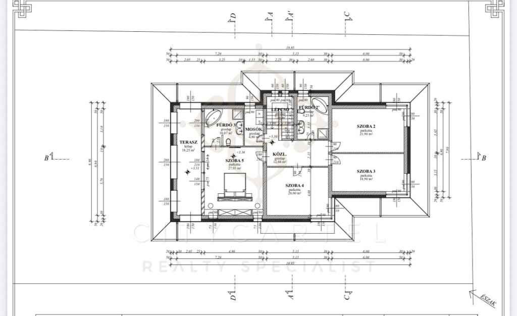 A teljes lakóterület 300 nm, és a ház kiosztása tökéletesen átgondolt a mindennapi használhatóság szempontjából. A nappalin kívül összesen 5 teljes értékű, könnyen berendezhető (szabályos téglalap alakú) szoba található.