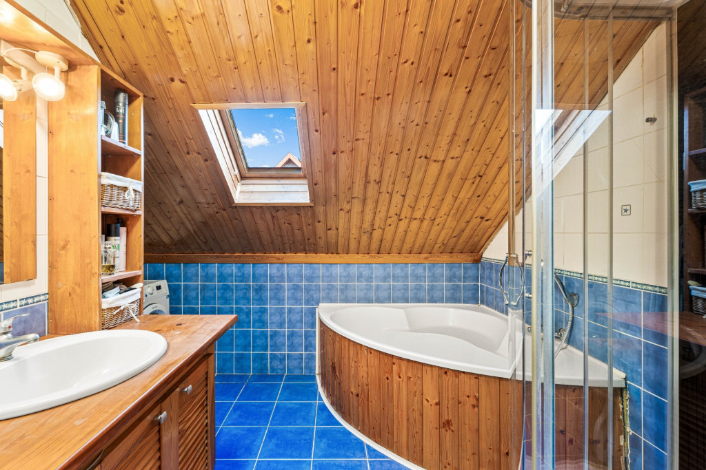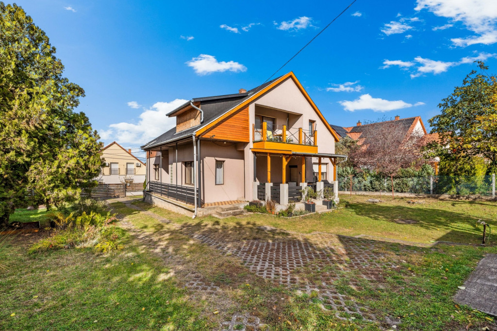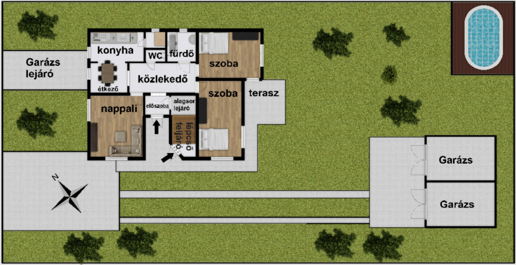 Földszinten: nappali, konyha, étkező, 2 szoba, 2 fürdő, WC, tároló, előszoba, közlekedő,