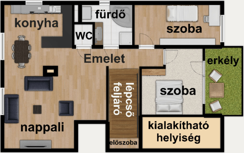 Amerikai konyhás nappali, 2 szoba, fürdő, WC, erkély, + kialakitható 10m-es helyiség.