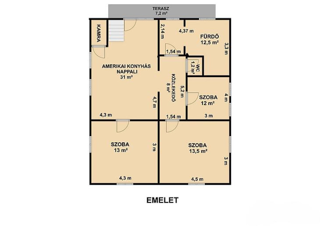 Elrendezés: 3 szoba, konyha, kamra, kádas + zuhanyzós fürdőszoba wc-vel, előszoba, közlekedő, tároló, terasz.