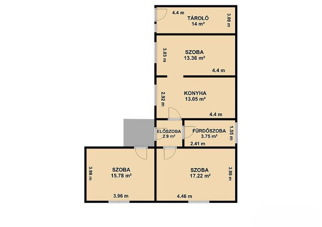 3 szoba, konyha, fürdőszoba + wc, 14 nm-es tároló és 30 nm-es pince.
