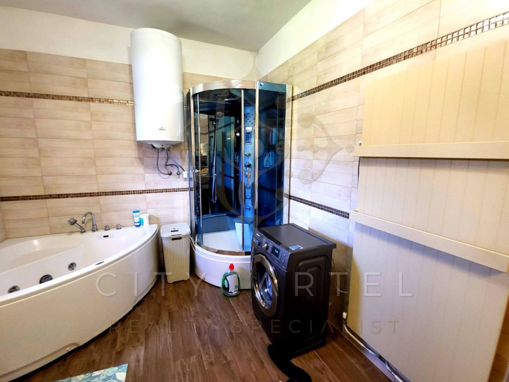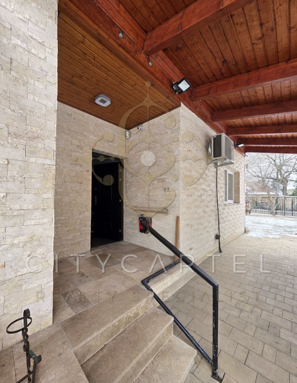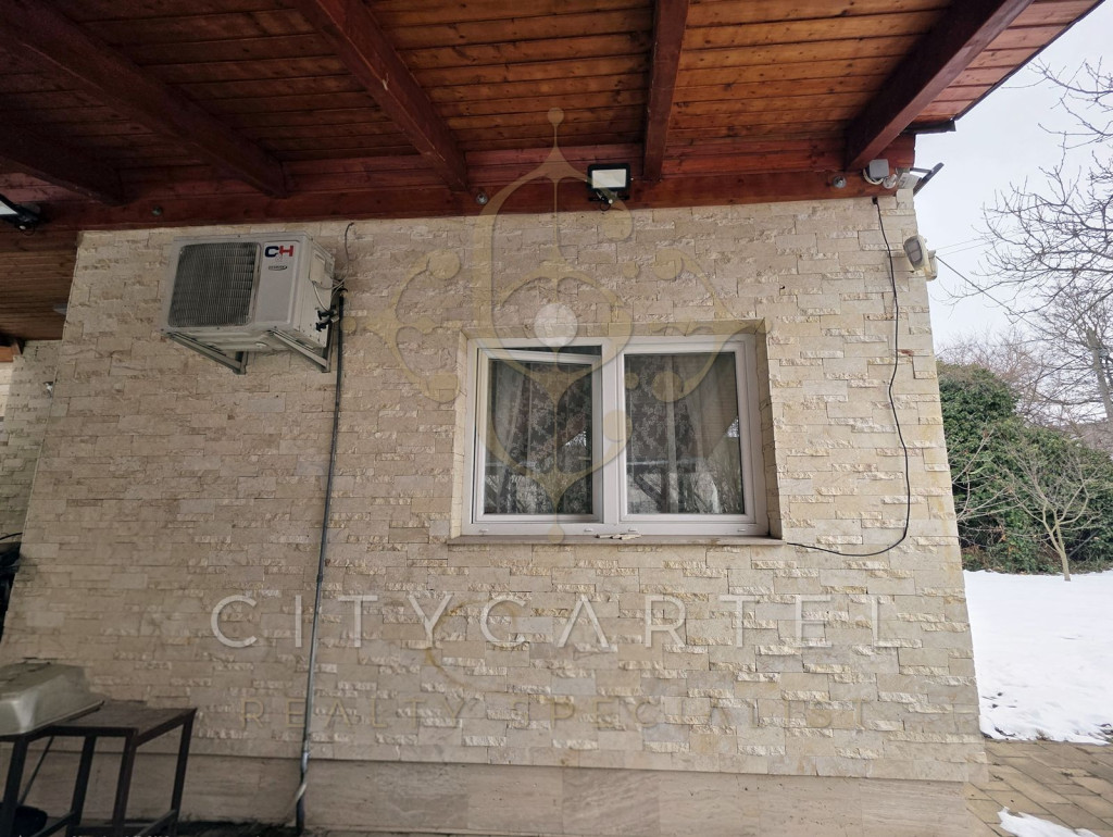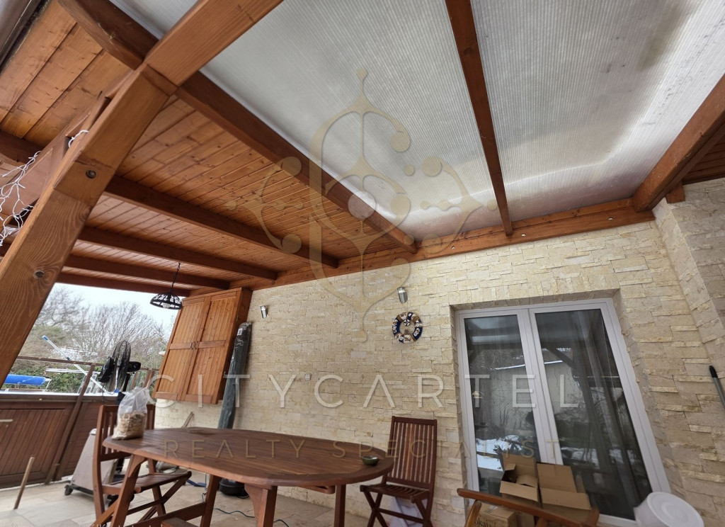 A ház kívülről 10 cm-es szigetelést kapott, alapja tört márvány. Két autó részére fedett beálló, de még legalább négy autóbeállási lehetőség. A bejárat mellett tágas, fedett terasz található.