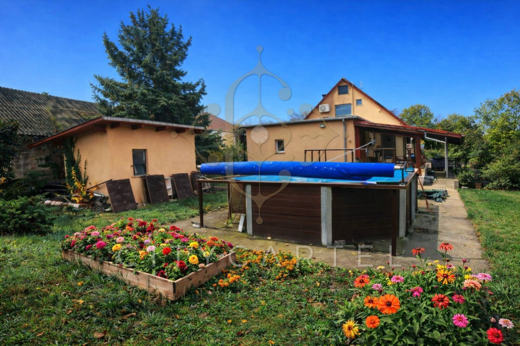 A gépkocsibeálló és terasztető igényes fa burkolatú. Hátul 6x4 nm-es hűszivattyús kültéri medence, köves szalonnasütő.