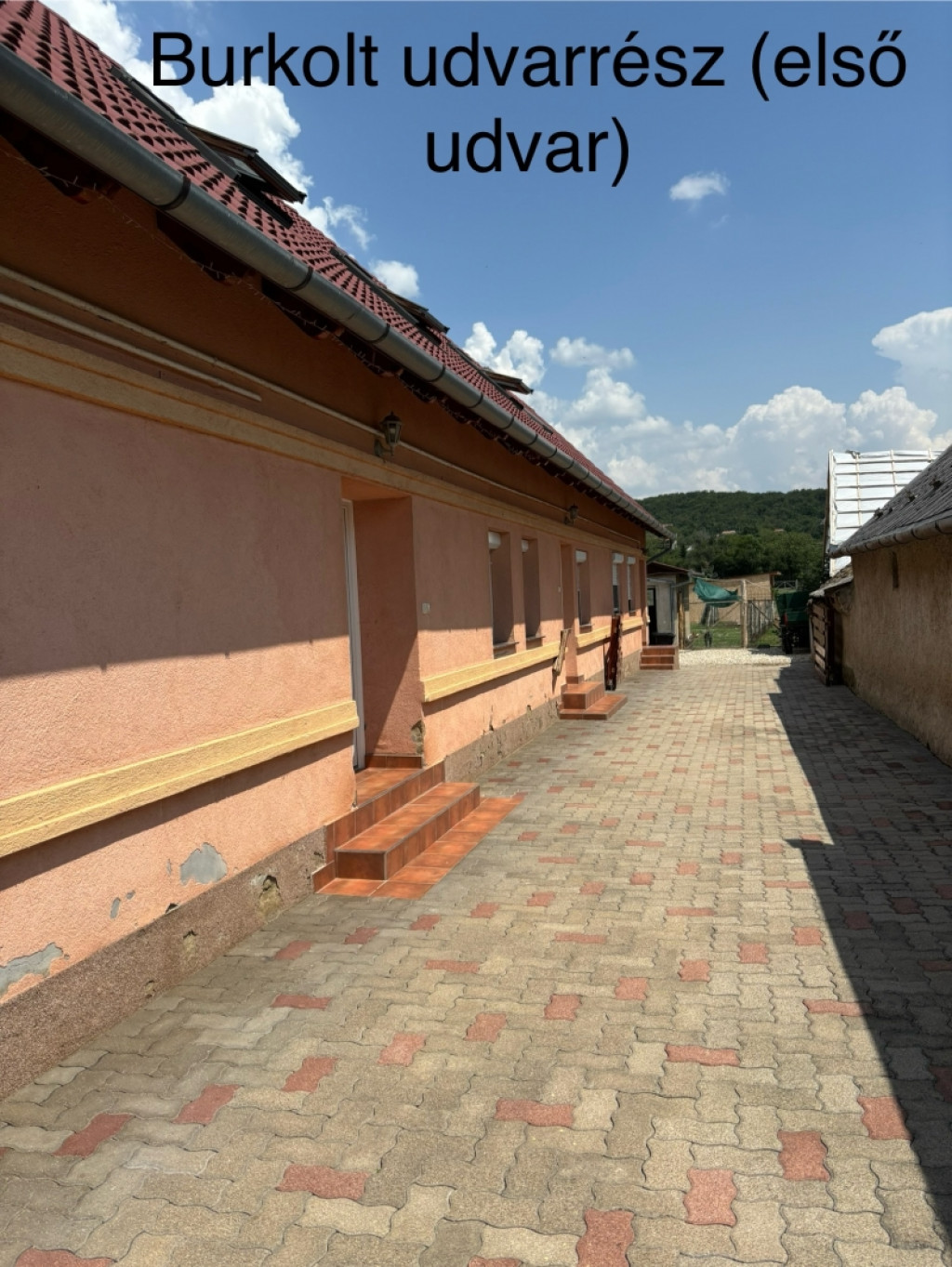 A ház zárt udvarához tartozik egy faszerkezetű tetővel fedett pihenőrész, illetve egy 35 m2 hasznos területű tégla falazatú garázs.