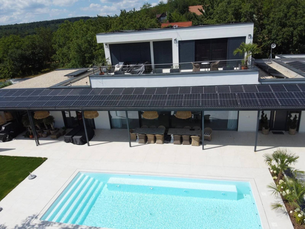 A villa műszaki felszereltsége a modern prémium kategória minden elvárását felülmúlja. A hőszivattyús fűtési rendszer, a padlófűtés és a korszerű klímatechnika egész évben kiegyensúlyozott komfortot biztosít, miközben az energiatakarékos működés hosszú távon is fenntartható. A nagy teljesítményű napelemes rendszer és az energiatárolás lehetővé teszi az ingatlan közel teljes energiafüggetlenségét, ami nemcsak kényelmet, hanem komoly értékállóságot is jelent. Ez az otthon nemcsak luxust kínál, hanem hosszú távon is tudatos és értékálló befektetés.
