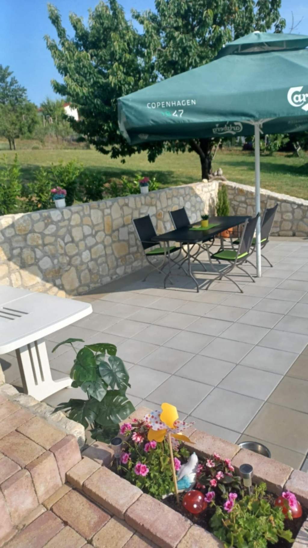 Az enyhén lejtős telek teljesen körbe van kerítve, ebből két oldal teljesen új. A ház előtt pihenő terasz lett kialakítva, körben gyümölcsfák, dísznövények díszítik a környezetet.