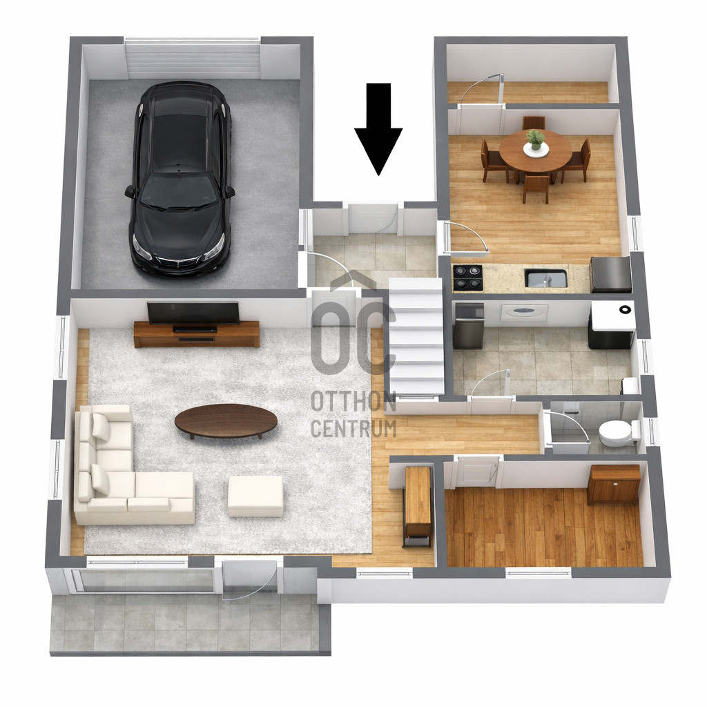 A földszinten egy tágas nappali, egy külön nyíló szoba, egy fürdőszoba, külön mellékhelyiség, valamint egy világos, jól használható konyha található, a garázs pedig közvetlenül kapcsolódik az épülethez, ami kényelmes parkolást biztosít.