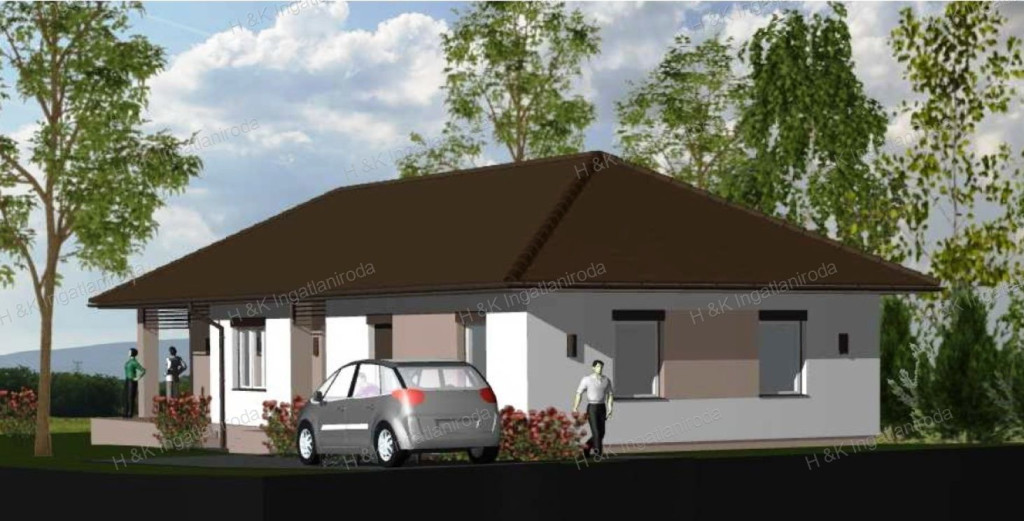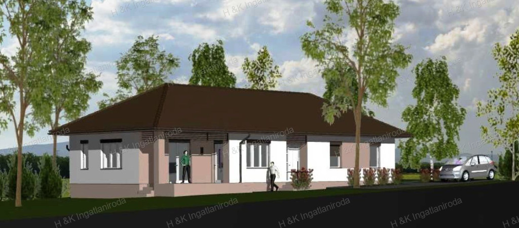 A ház 857 nm-es telekre épül, lakóterülete 112.56 nm + 15,85 nm terasz, nappali + 3 szobás, dupla-komfortos elrendezéssel.