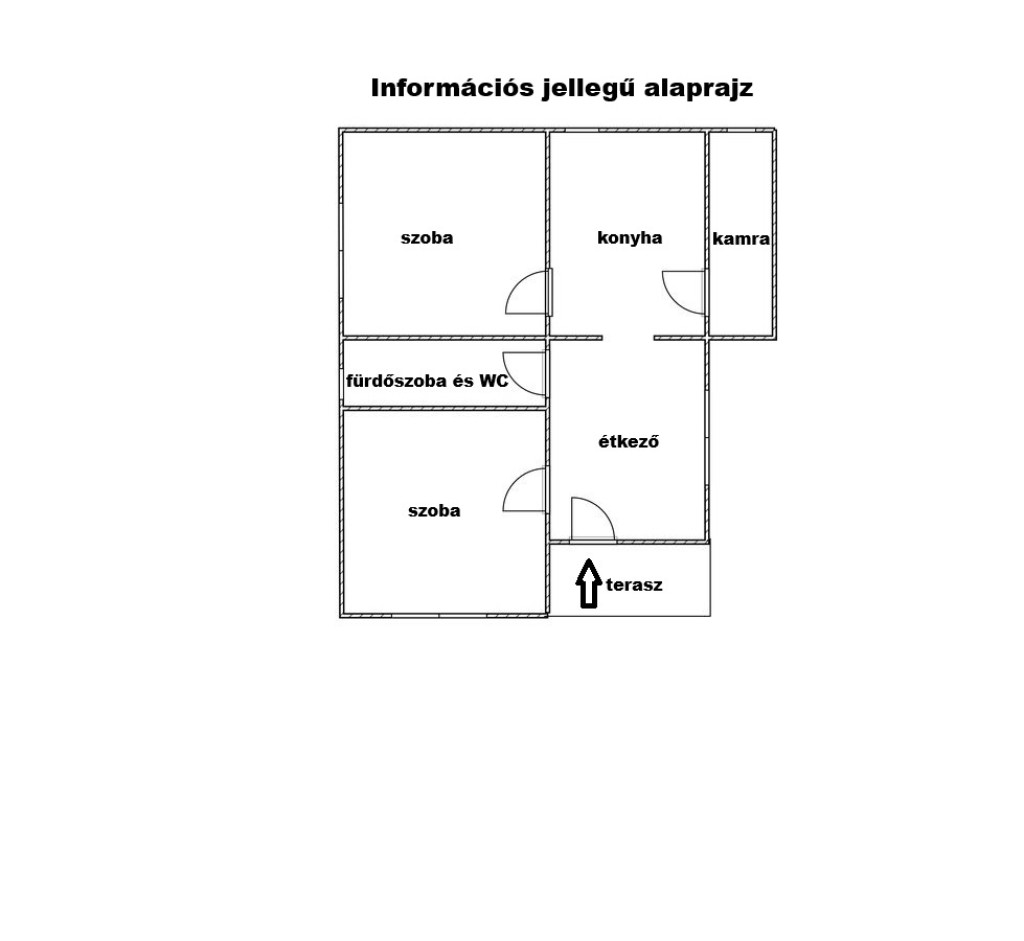 - a helyiségek a következőek: 2 külön nyíló egész szoba, étkező, konyha, fürdőszoba és WC, kamra, terasz