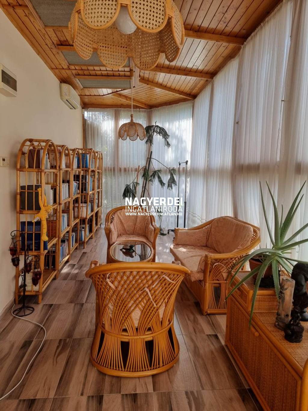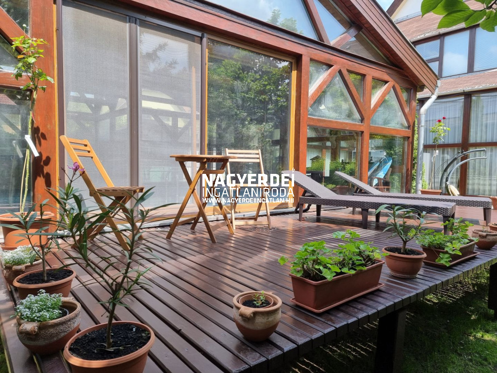 A főépületet egy 140 m²-es medenceház egészíti ki, amelyhez hangulatos terasz kapcsolódik – ideális helyszín családi összejövetelekhez, pihenéshez vagy exkluzív vendégfogadáshoz.