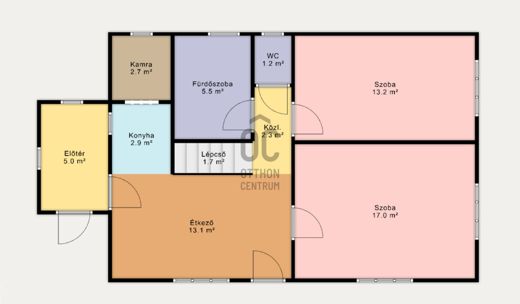 Földszint (60 m²): 2 külön nyíló szoba, konyha–étkező, kamra, külön fürdő és WC