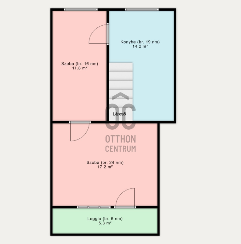 Emelet (nettó 46 m², bruttó 65 m²): 2 szoba, konyha, erkély