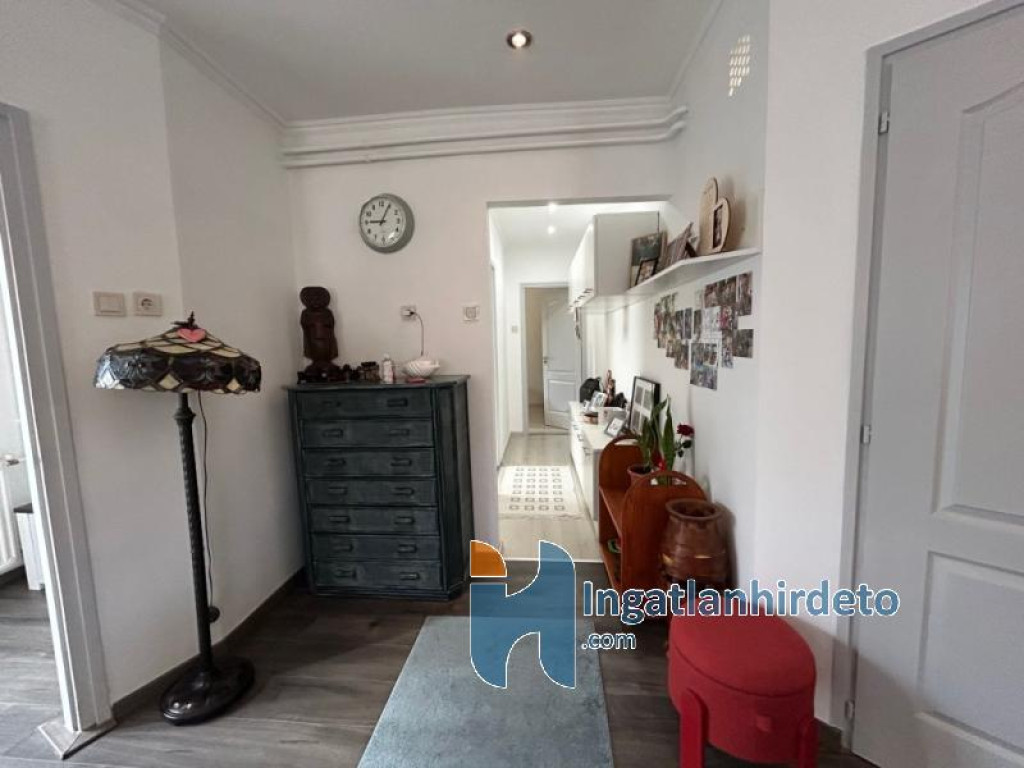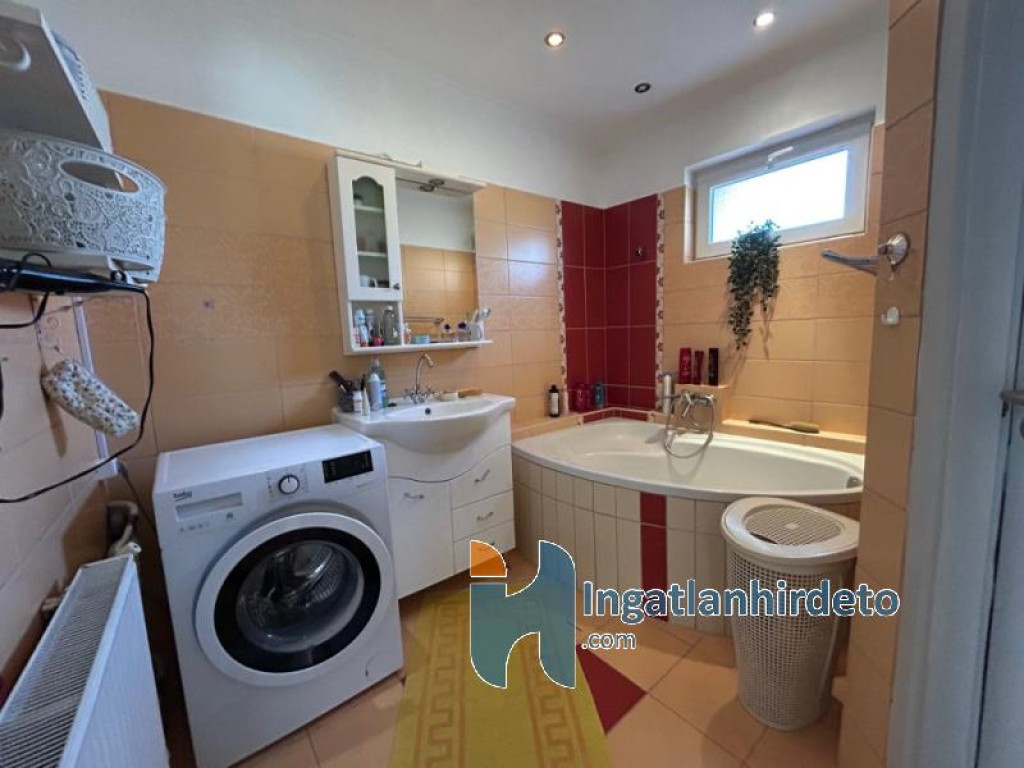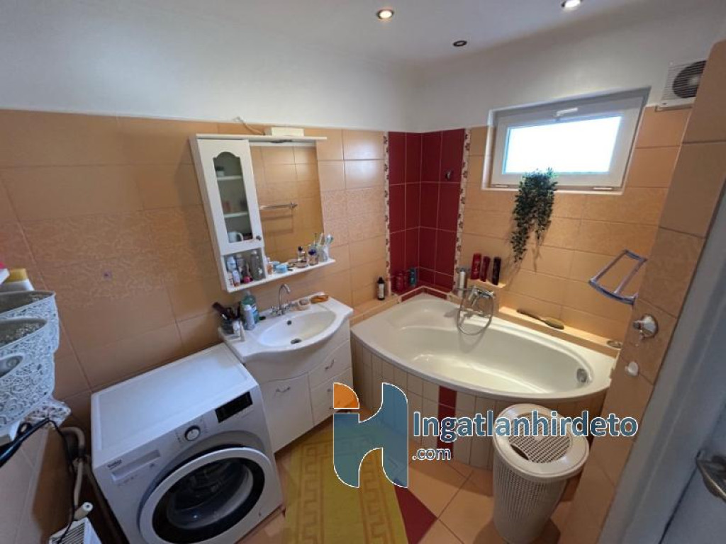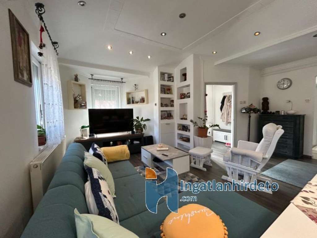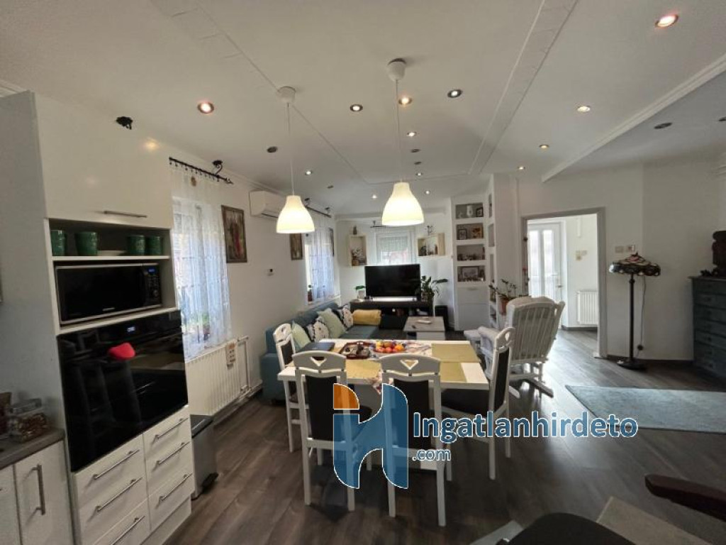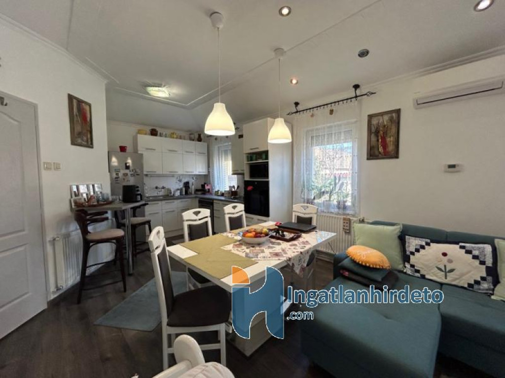 A ház elrendezése átgondolt és élhető: a világos nappali a lakás központja, amely kellemes életteret biztosít a mindennapokhoz, míg a két külön nyíló szoba nyugodt, privát pihenést tesz lehetővé. A gondosan kialakított, gépesített konyha praktikus spájzzal egészül ki, így nemcsak esztétikus, hanem kifejezetten jól használható is. A fürdőszoba és a mellékhelyiség külön került kialakításra, ami tovább növeli a komfortérzetet.