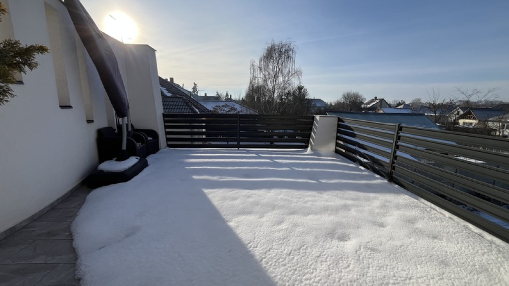 Az 50 m2-es fűtött dupla garázs külön fürdőszobával és egy plusz szobával egészül ki, amely kiválóan használható vendégszobának, irodának vagy hobbyhelyiségnek. A telken további gépkocsi-beállási lehetőség biztosított.