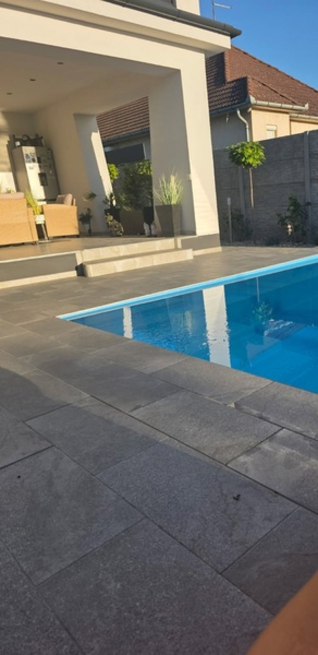 A kert parkosított, zöld és ténylegesen intim. A fedett terasz és a tetőterasz mellett 10×4 méteres, 1,80 m mély medence, kerti sütő, filagória, tárolók és fúrt kút található. A gyepszőnyeget és a növényzetet öntöző- és csepegtető rendszer támogatja.