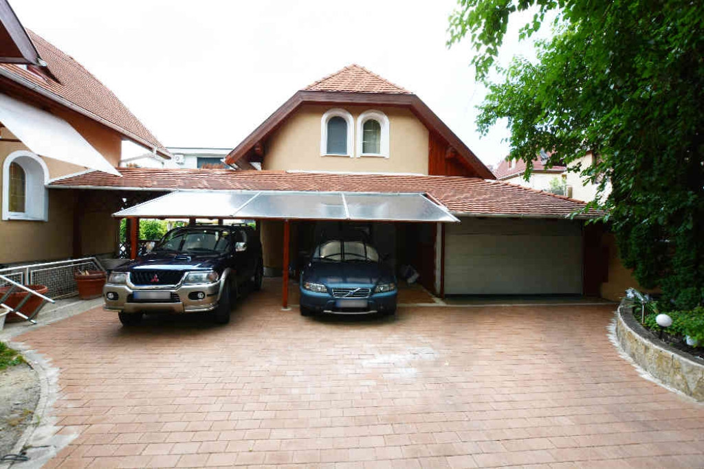 A parkosított kert központi eleme a feszített víztükrű úszómedence, emellett 60 m² garázs, 60 m² fedett beálló és akár 10 parkolóhely is rendelkezésre áll.