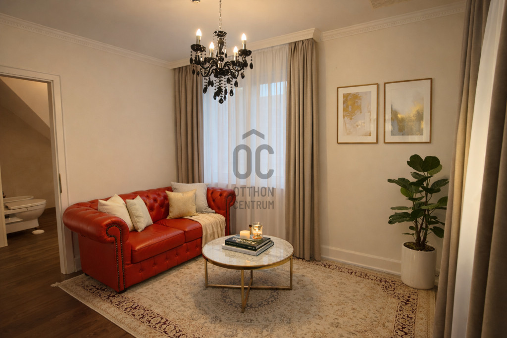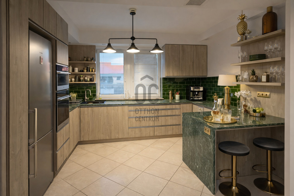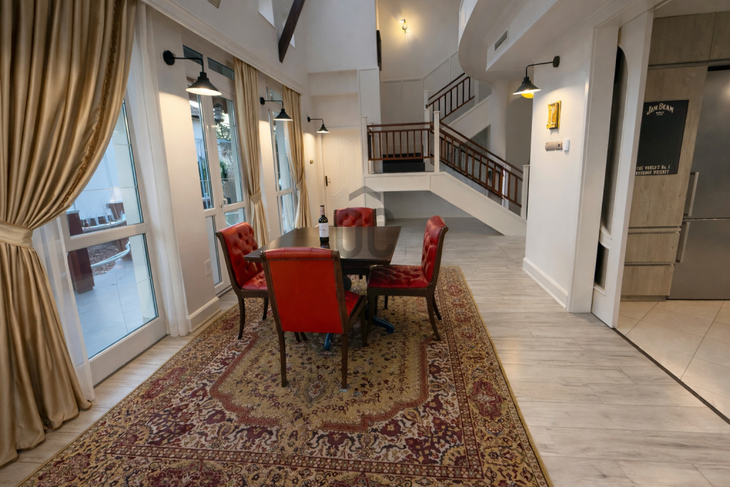 Az ingatlan egyik legkülönlegesebb eleme a lenyűgöző, 5,8 méteres belmagasságú étkező-nappali tér, amely villa hangulatot teremt.