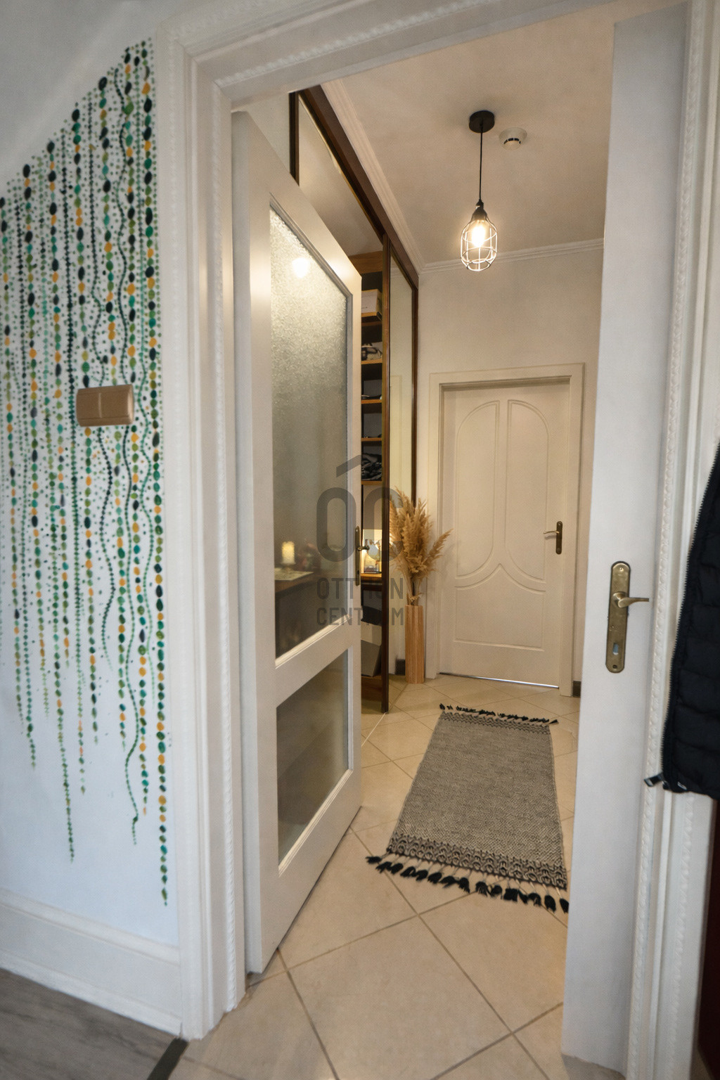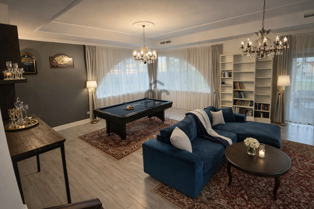 A mennyezetet klasszikus stukkó díszítés és elegáns díszlécek emelik ki, amely a modern klasszikus építészeti stílus egyik meghatározó eleme.