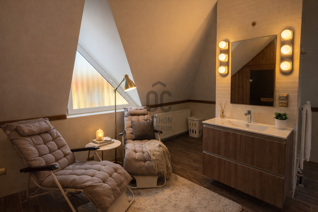 A ház különleges hangulata – a nagy belmagasságú nappali, a kandalló, a szauna és a tágas kert – egy olyan életstílust kínál, amely tökéletes választás azok számára, akik otthonukban szeretnének kikapcsolódni, vendégeket fogadni vagy családi és baráti összejöveteleket tartani.