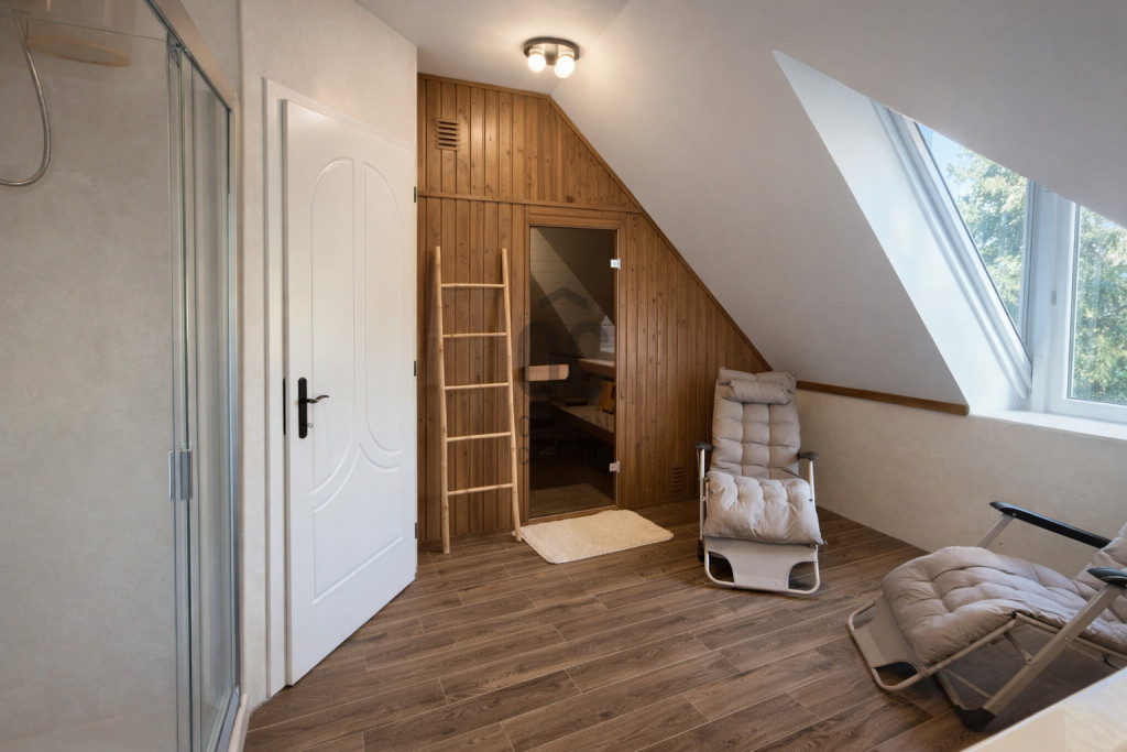 Az emeleti fürdőben egy 6 személyes finn szauna került kialakításra pihenőágyakkal.