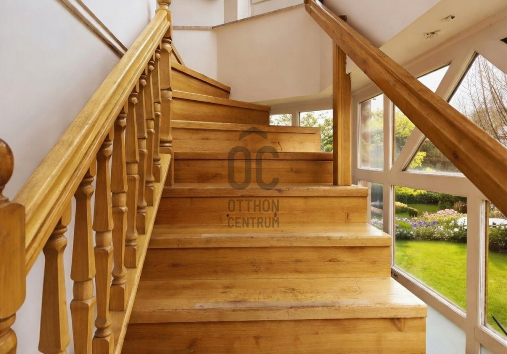 Egy elegáns fa lépcső vezet fel a felső nappaliba.